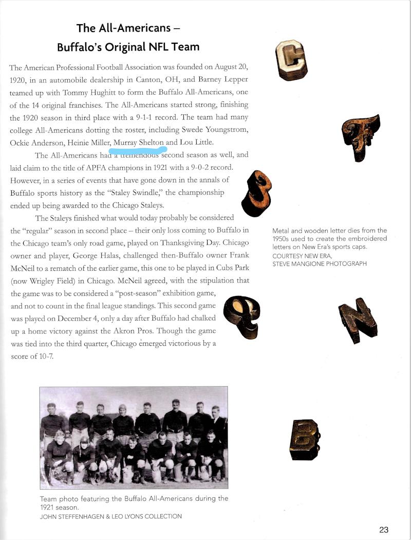After graduating from Cornell, Shelton spent a year coaching in Joliet, Illinois Then came a stint as an officer in the field artillery during World War I. His sports career continued with professional football when he returned to the United States. Shelton played with a team called the Buffalo All-Americans and played with and against Jim Thorpe.