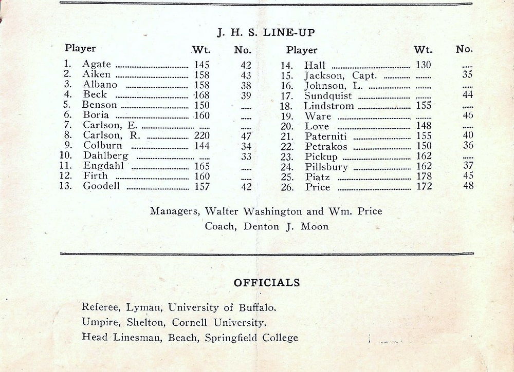 He played varsity football for three seasons and his greatest feat play came in the 1915 game against Harvard. He recovered a fumble on the Harvard 25 yard line that led to the only touchdown of the game. Cornell won 10-0 for its first win over Harvard in 25 years.