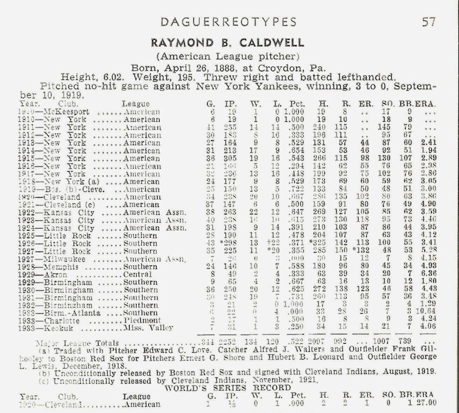 When the spitball was outlawed in 1920, Caldwell was of 17 pitchers allowed to continue throwing the pitch.