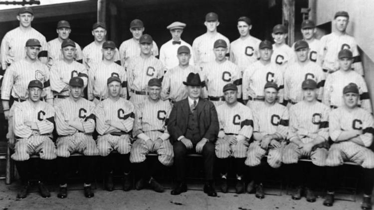 ![1920 Cleveland Indians. They are wearing black armbands honoring the memory of Ray Chapman. Ray Caldwell, first row, second from left. Photo courtesy of SABR Pictorial on Twitter (@SABRPictorial)