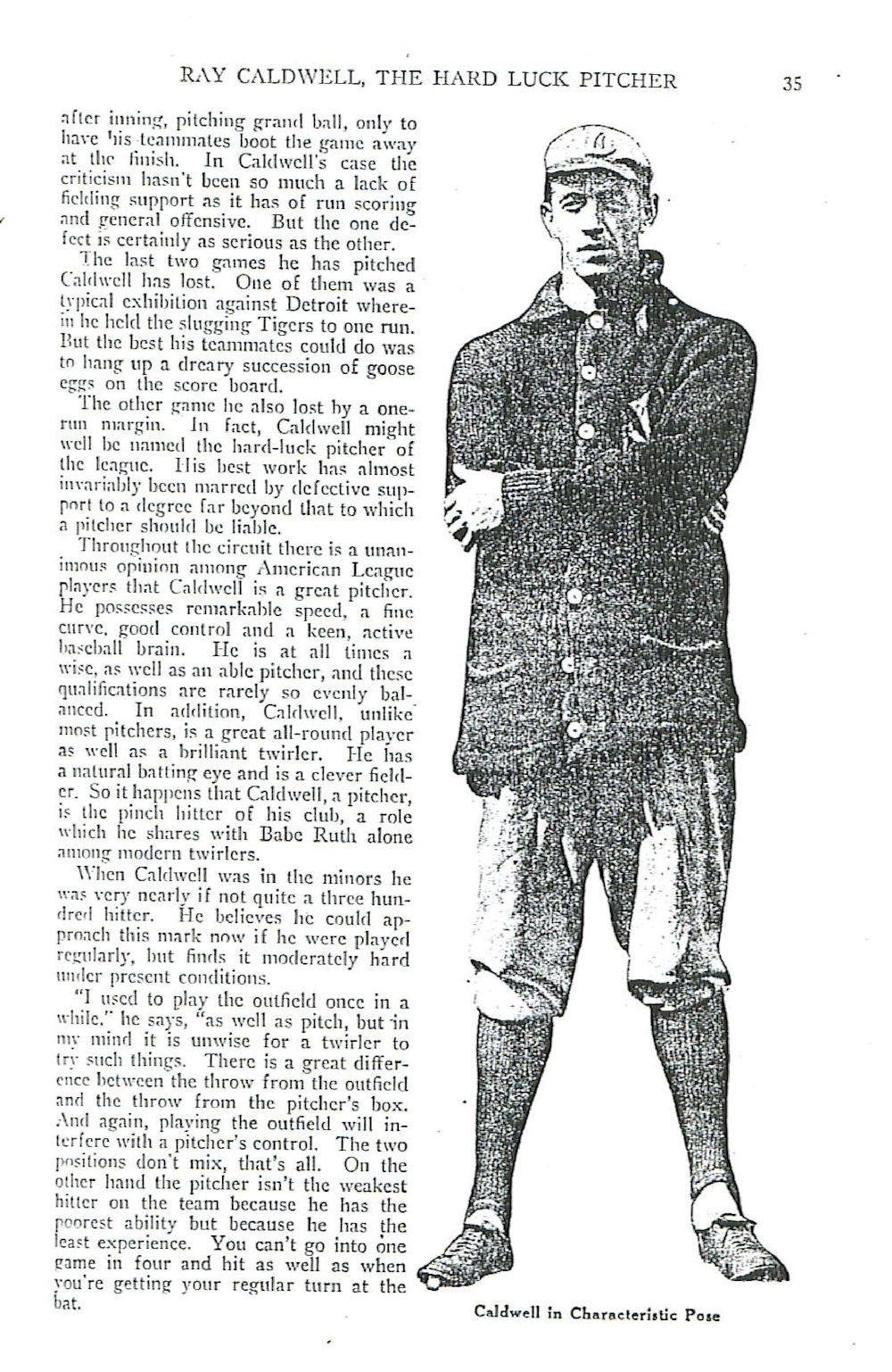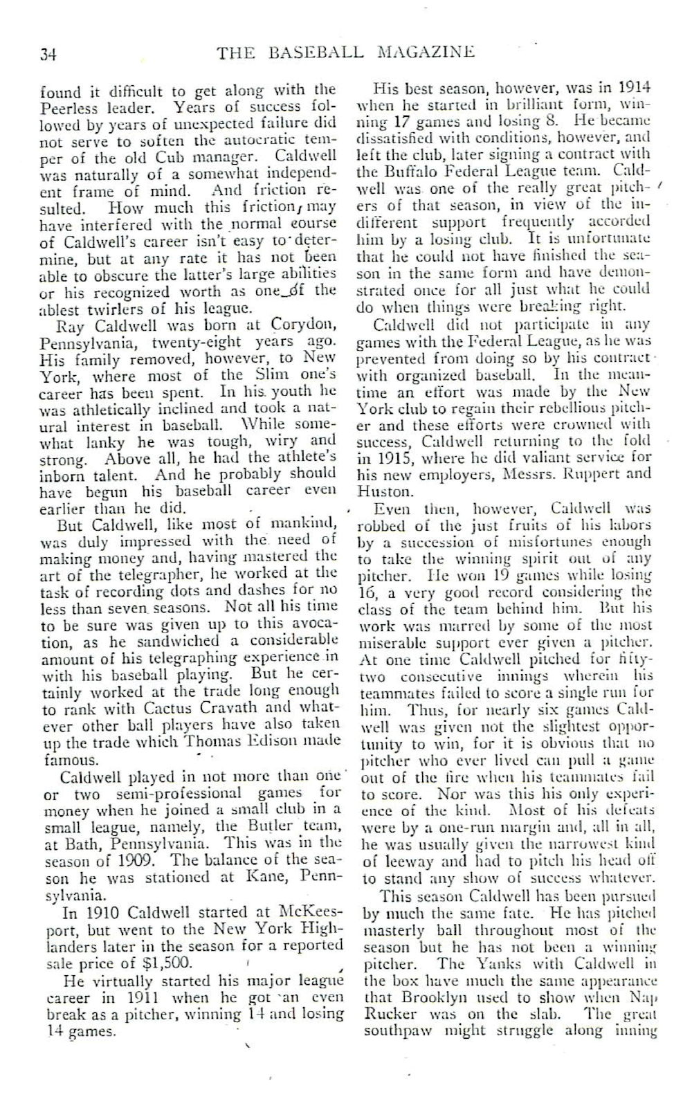 And Fred Lieb, who covered baseball for 70 years, wrote in 1918, "Caldwell might have the Mathewson of the Yankees, but he turned out to be the Bugs Raymond of the local Americans. His irregular habits destroyed his effectiveness."