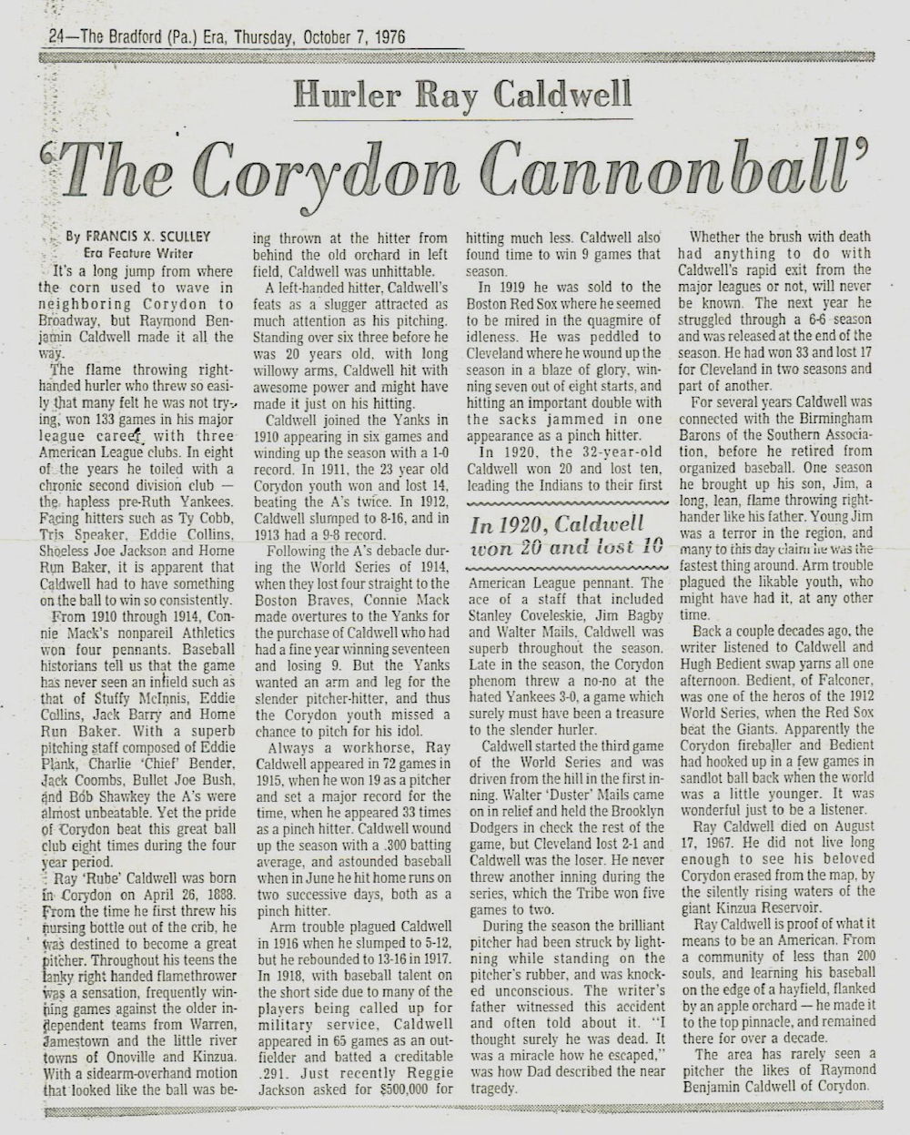 - Hyde, Frank. "Caldwell, 20-Game Winner of 1920 Indians, Recalls Turbulent Days of Great Campaign; Picks '48 Tribe." Post-Journal (Jamestown), October 6, 1948.