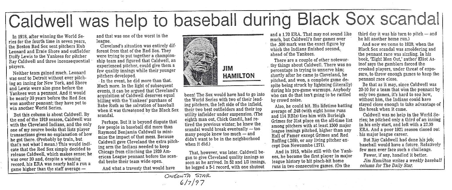 - Serkownek, Edith. "Ray Caldwell - Pitcher with 'the arm, the head and the heart'." unknown source and date.
