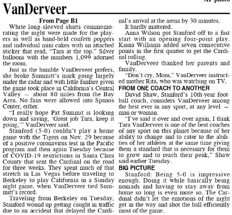 VanDerveer won three NCAA titles at Stanford. She captured the crowns in 1990, 1992 and 2021. Her teams made 13 appearances in the NCAA Final Four.