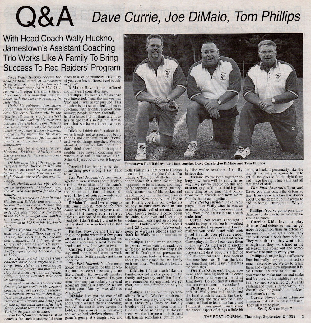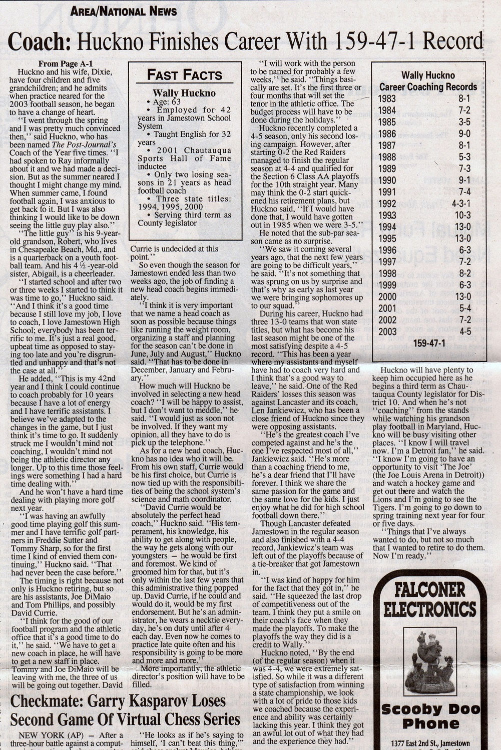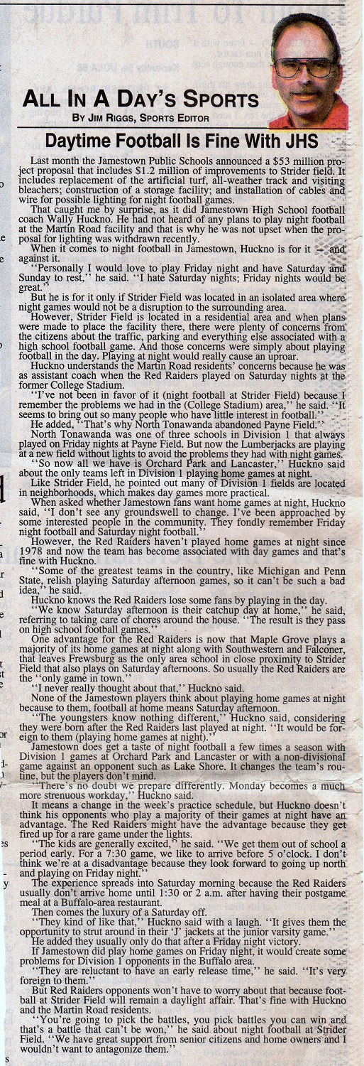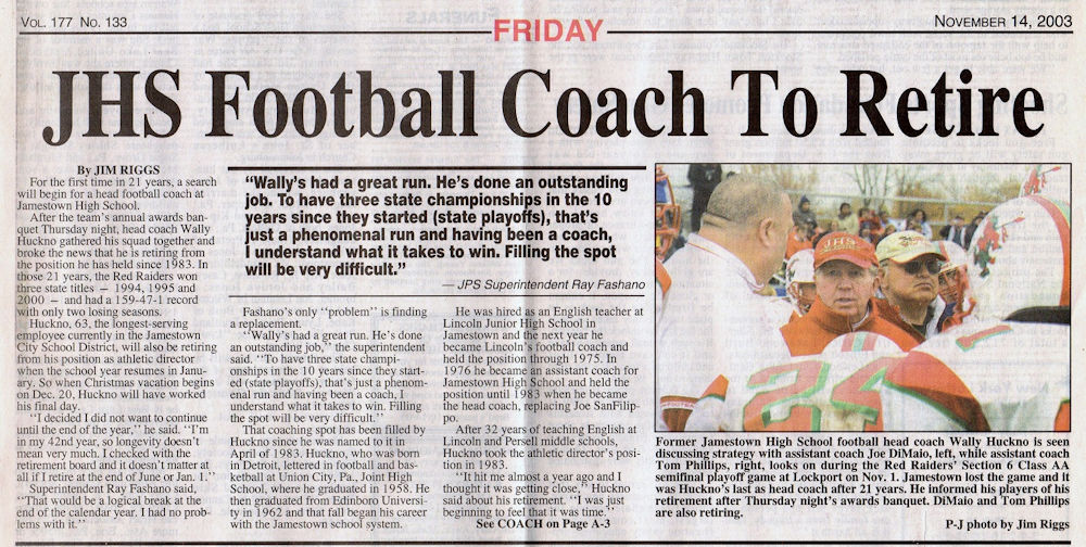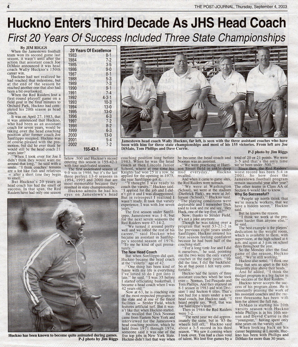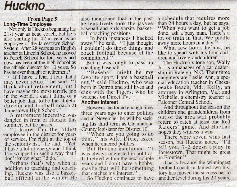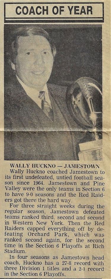 Joe Sanfilippo decided to step down and Huckno was appointed to the position, beginning a legendary career that started off strong as Jamestown claimed the Division 1 title, which included the first of 11 appearances in the Section 6 championship game at Rich Stadium and later Ralph C. Wilson Stadium in Orchard Park. The Red Raiders also earned trips in 1984, 1986, 1989, 1990, 1991, 1993, 1994, 1995, 1998, and 2000.