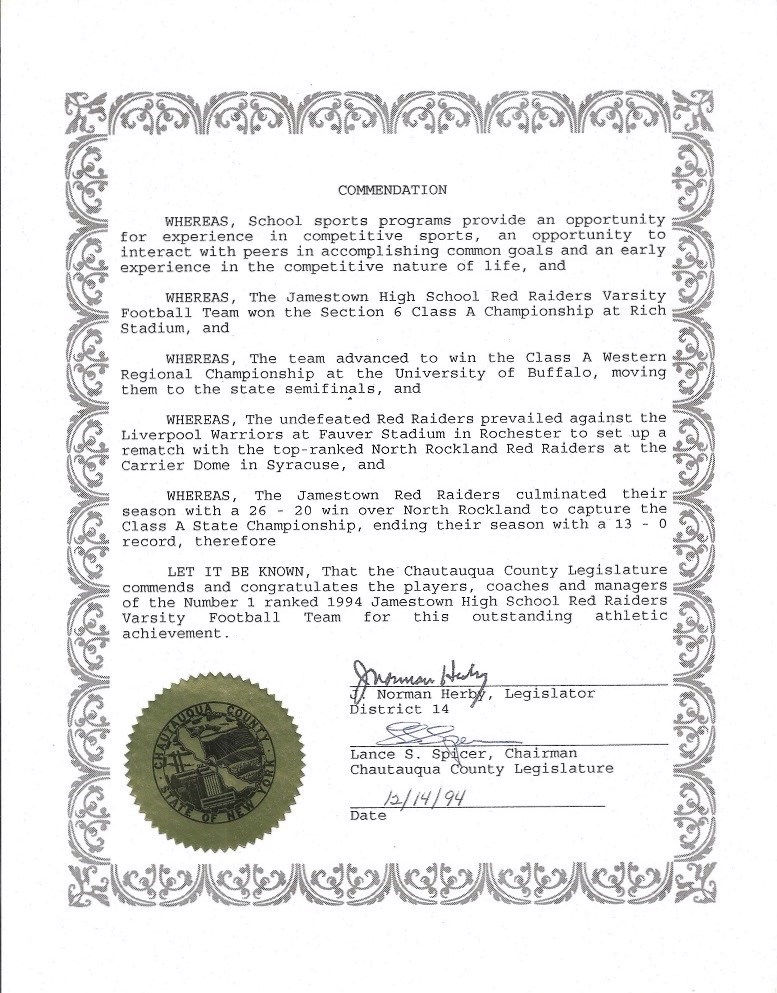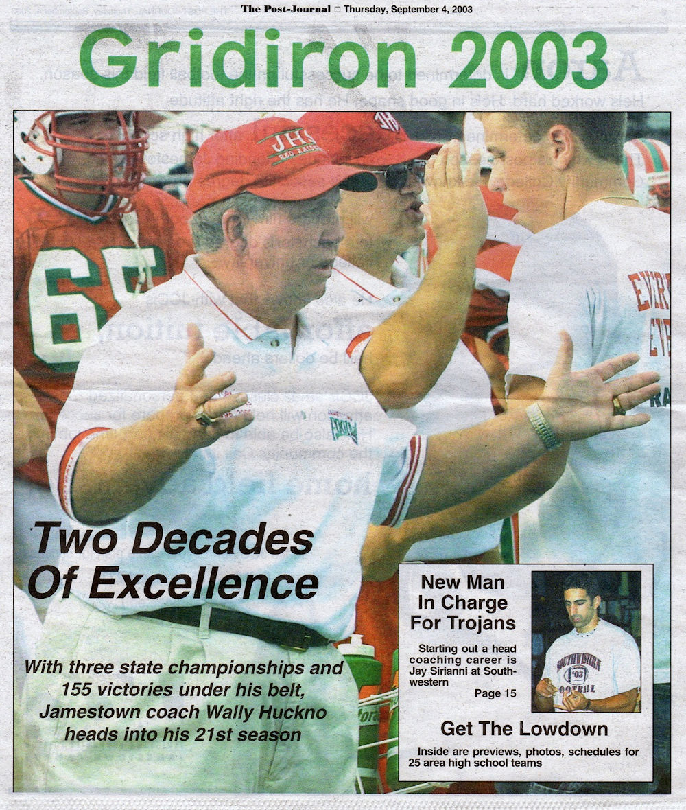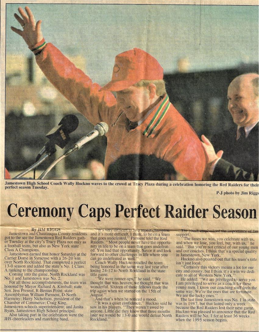Unphased by the loss, Huckno's 1994 squad produced an undefeated season and earned a return trip to Syracuse where the Red Raiders gained a measure of revenge and their first state championship by topping North Rockland to take the Class A crown. In 1995, Jamestown's dominance continued as they repeated as state champions by beating Shehendehowa for the title.