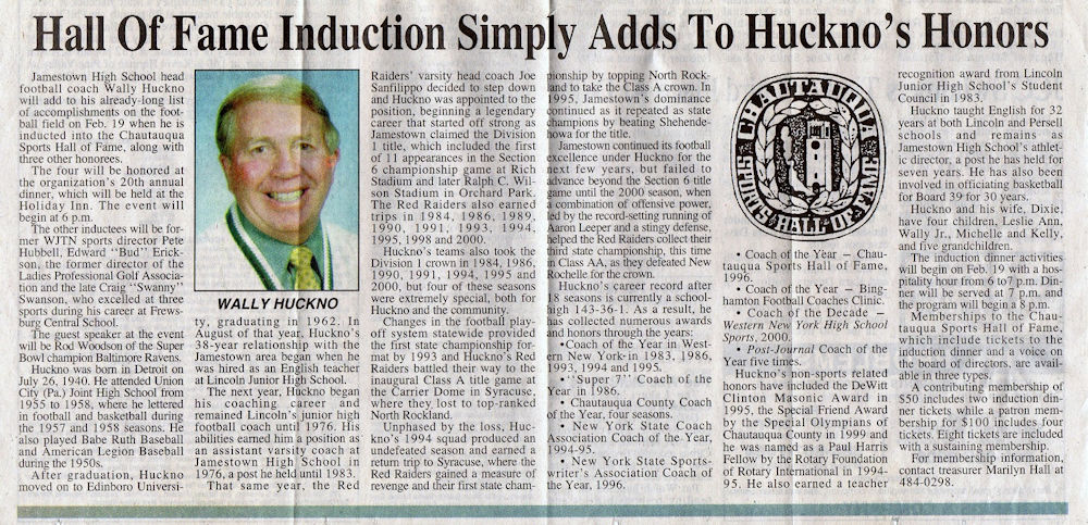 Huckno retired in as the winningest coach in Jamestown football history with a record of 159-47-1. As a result, he has collected numerous awards and honors through the years: