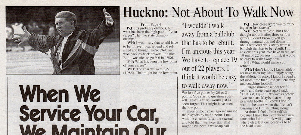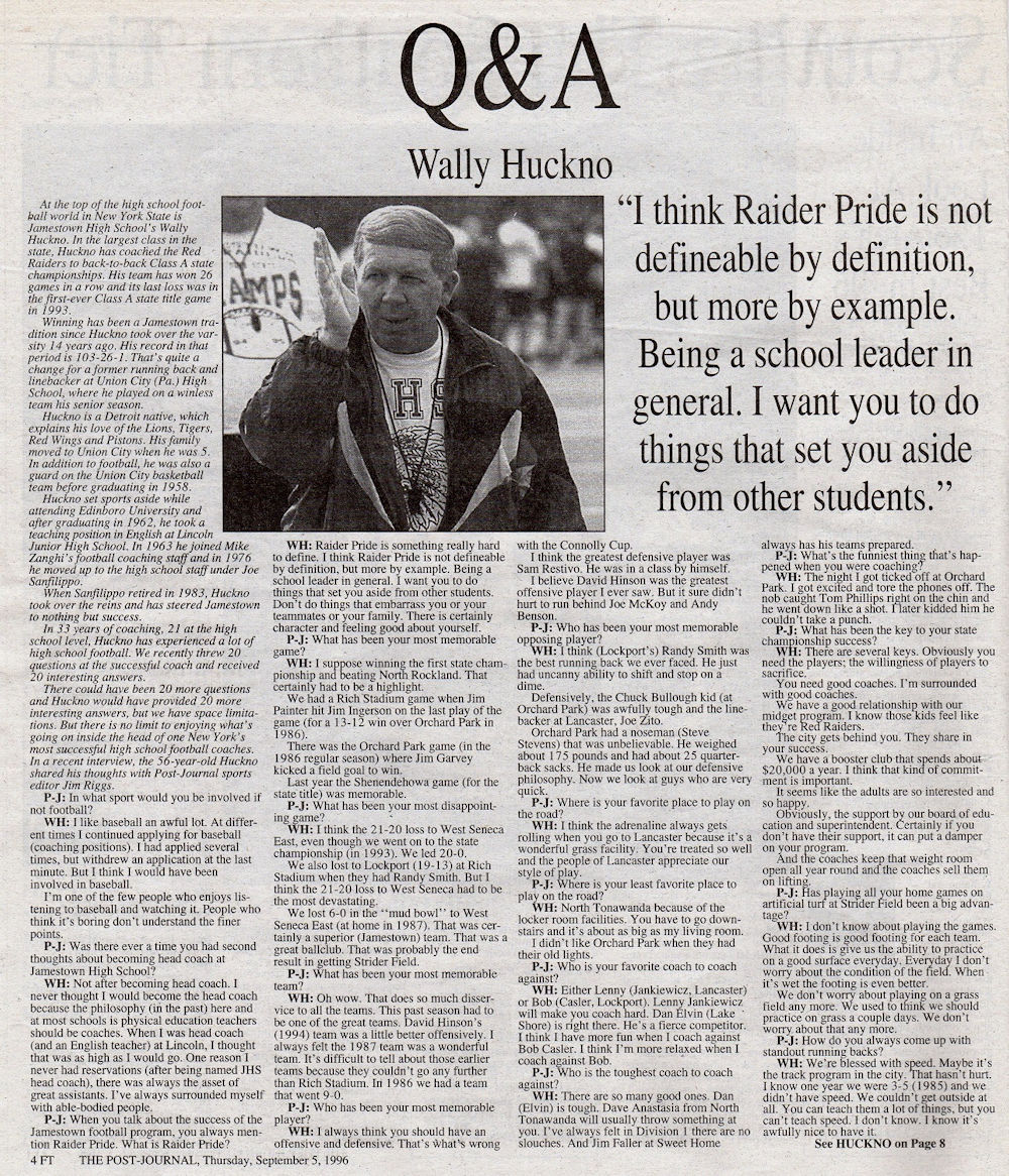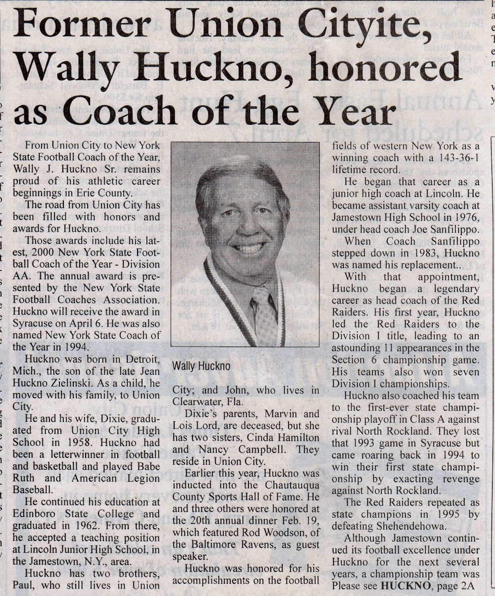 Huckno's teams also took the Division 1 crown in 1984, 1986, 1990, 1991, 1994, 1995 and 2000, but four of these seasons were extremely special, both for Huckno and the community. Changes in the football playoff system statewide provided the first state championship format by 1993 and Huckno's Red Raiders battled their way to the inaugural Class A title game at the Carrier Dome in Syracuse, when they lost to top-ranked North Rockland.