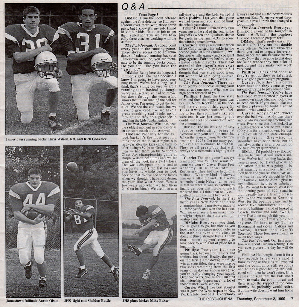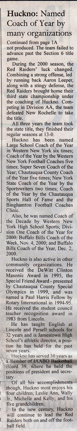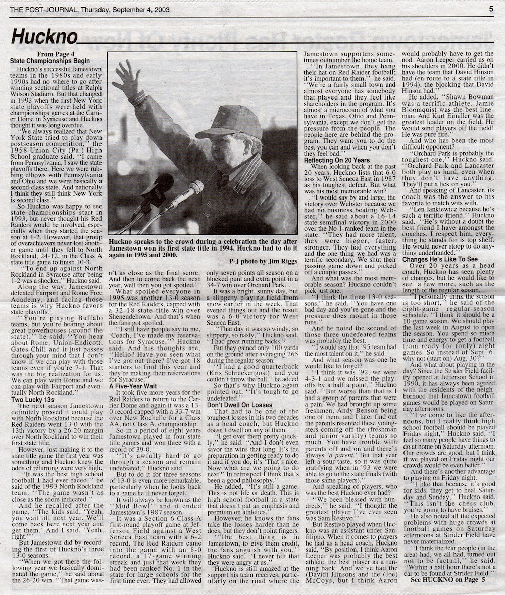 Jamestown continued its football excellence under Huckno for the next few years, but failed to advance beyond the Section 6 title game until the 2000 season when a combination of offensive power, led by the record setting-running of Aaron Leeper and a stingy defense, the Red Raiders collected their third state championship, this time in Class AA, as they defeated New Rochelle for the crown.