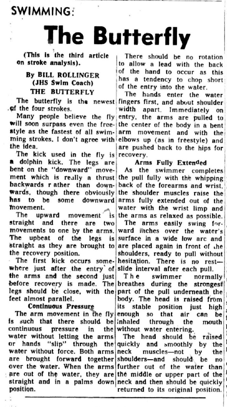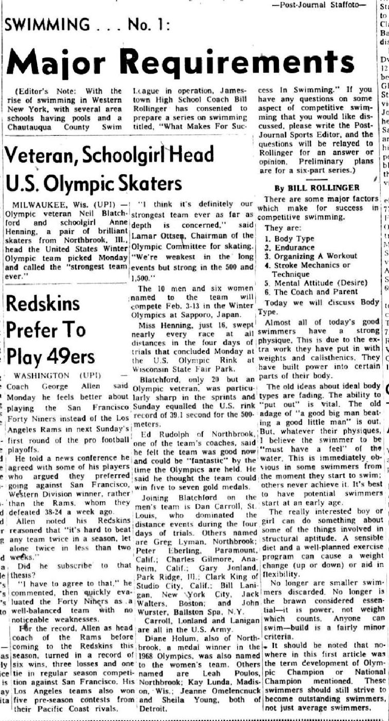 What really assisted the Jamestown program was the formation of the Greater Jamestown Swim Club with help from Tony LeVoie of the Jamestown Boys Club and Harold Leach from the YMCA. This was a year round program and was a great feeder system for Rollinger and the Red Raiders.