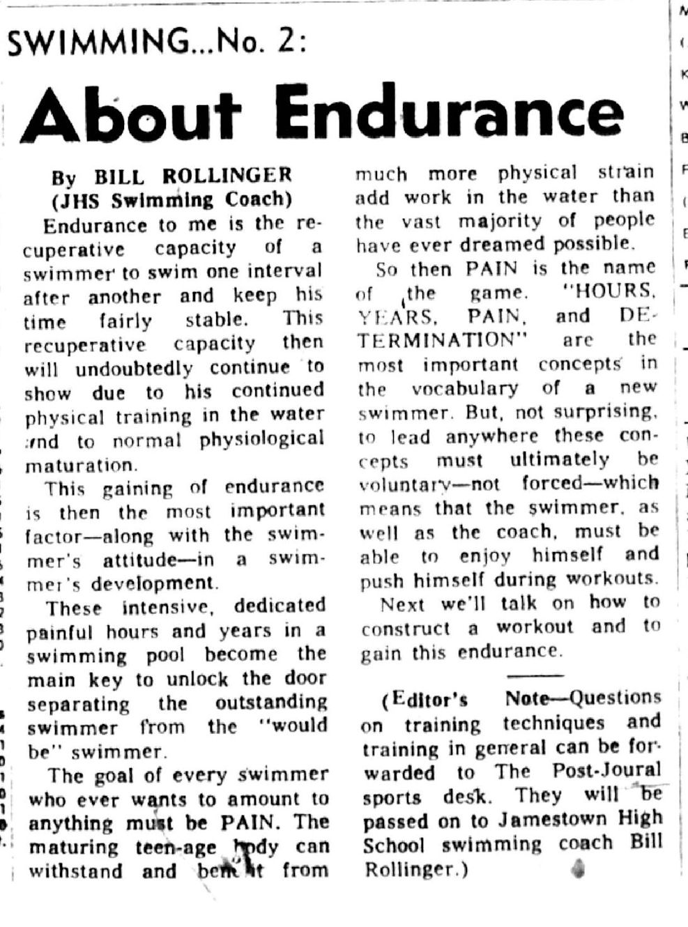 Besides starting the Greater Jamestown Swim Club, Rollinger was past president of the New York State Officials, Western New York Swim Coaches Association, Jamestown Swim Officials and the Niagara District AAU Water Polo.