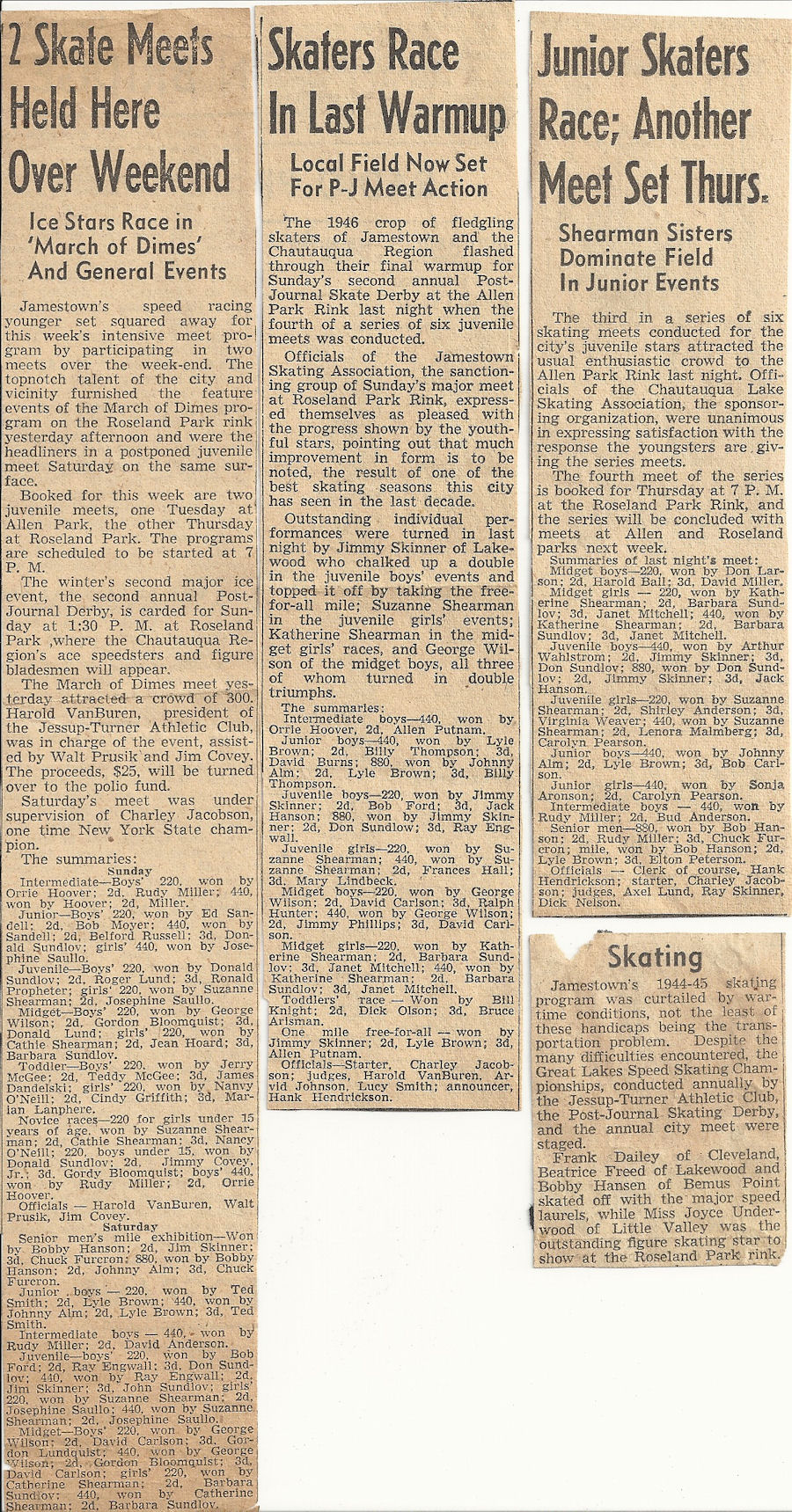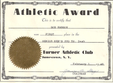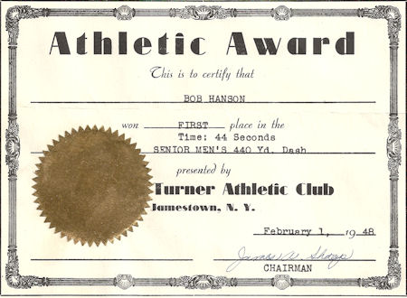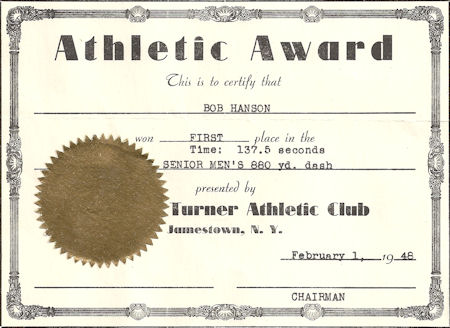 During World War II Hanson reached his peak when he finished third in the North American Championships at Schenectady. He then turned to coaching the Jamestown Speed Skating Club which competed in places like St. Paul, Minnesota, Detroit, Kitchener, Ontario, Pittsfield, Massachusetts, and Lake Placid.
