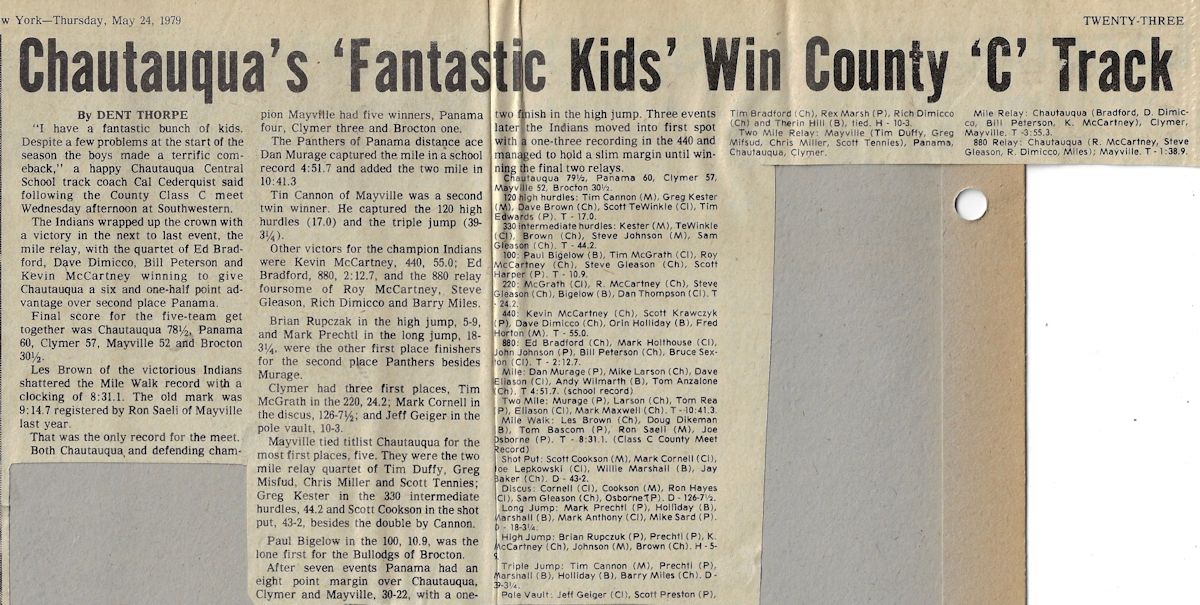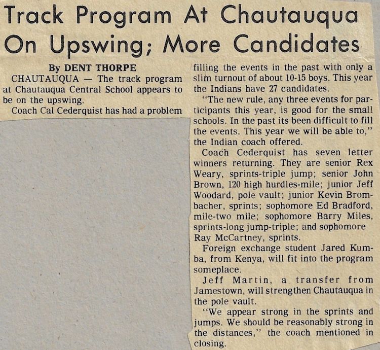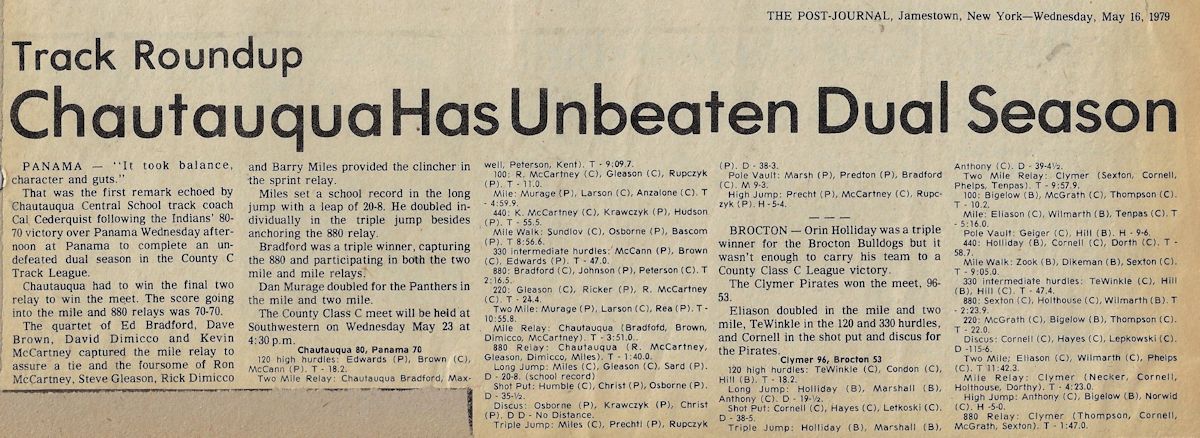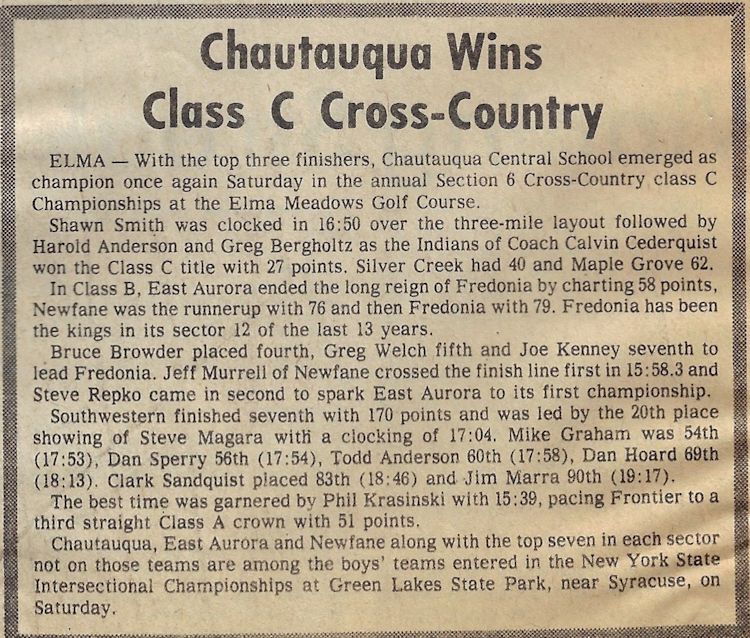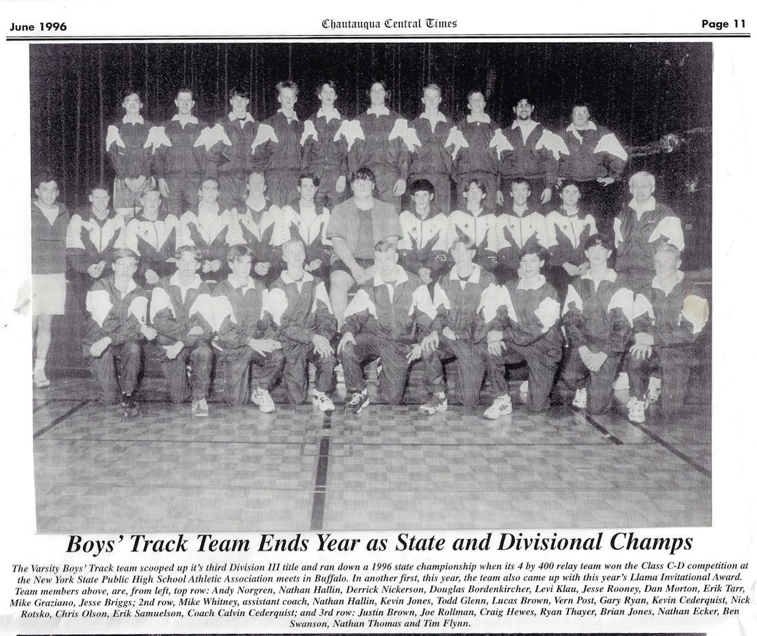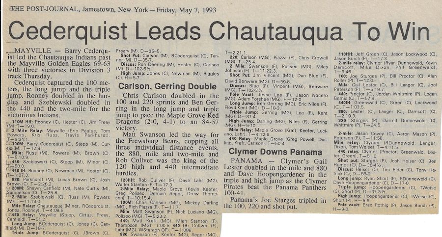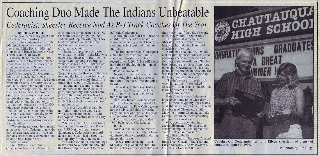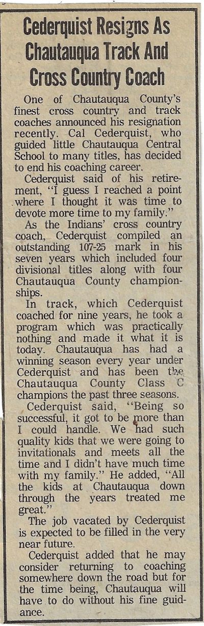 His teaching and coaching career began at the original Chautauqua Central School in 1972 working with a track team that hadn't won a dual meet or a championship in 40 years. Without any real track facilities and a dozen or fewer athletes, Cederquist worked tirelessly and turned the program into a winner, claiming three consecutive championships and sent several of his athletes to Section 6 qualifiers from 1979-81, including Shawn Smith, who was a Section 6 1,000 meter champ and the sectional record holder.