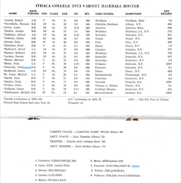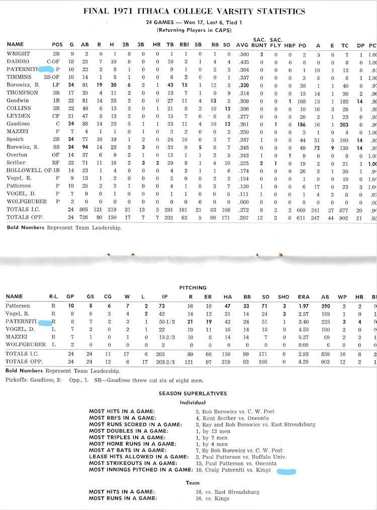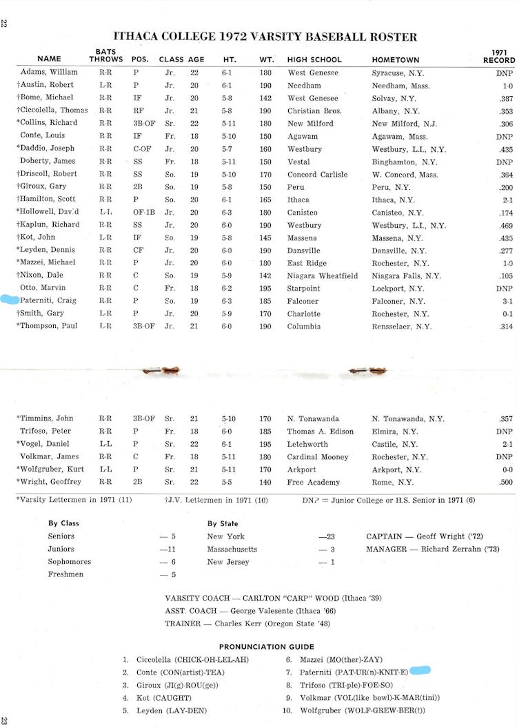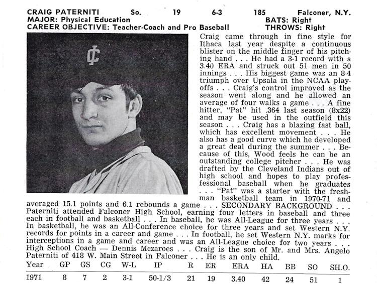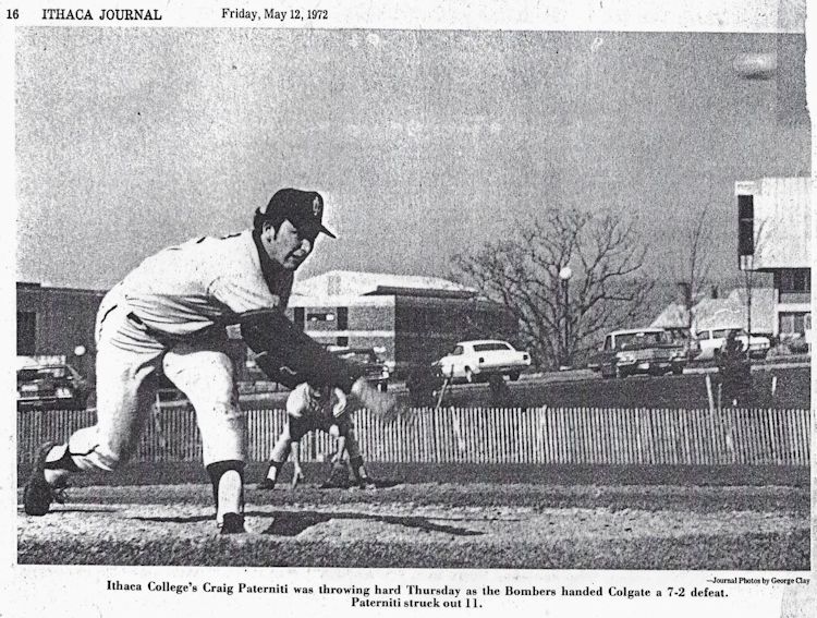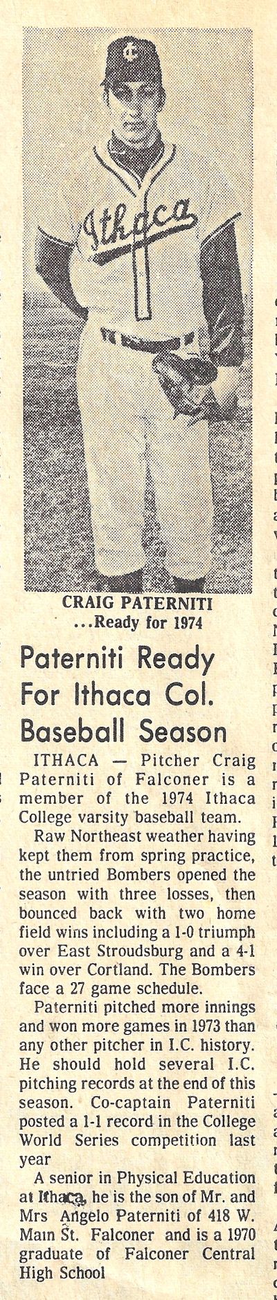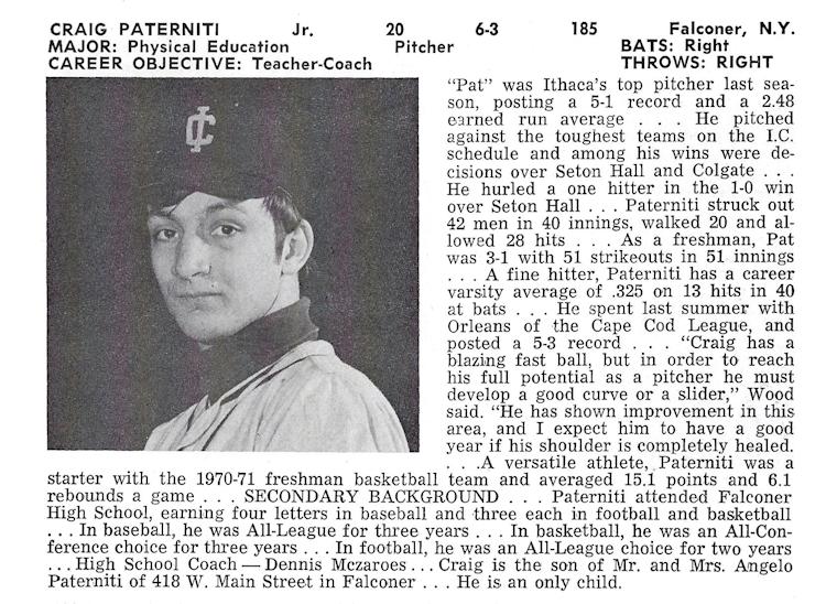 During his freshman season (1970-1971) at Ithaca, Paterniti participated in junior varsity basketball and was the second-leading scorer with a 16-point average. Due to his baseball scholarship, he didn't play varsity basketball. From 1971-1974, Paterniti accomplished a great deal in his baseball career as a pitcher and was the only freshman on the team. His junior season was very memorable as he guided Ithaca to a runner-up finish in the College World Series in its bracket.