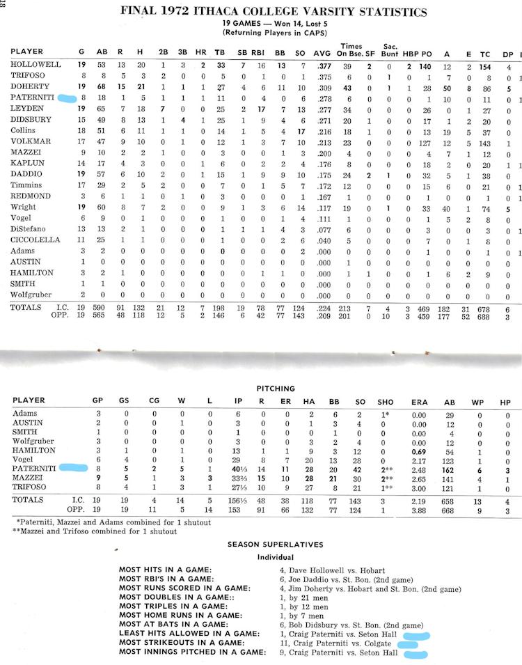 He compiled a team-leading 9-3 record while having a 2.38 earned run average with 54 strikeouts in 87 1/3 innings. His 3-2 win over Eastern Illinois allowed the Bombers to advance to the championship where they lost to University of California at Irvine. Paterniti was an ICAC First Team all-star in 1972 and a Northeast Regional All-Tournament selection in 1974.