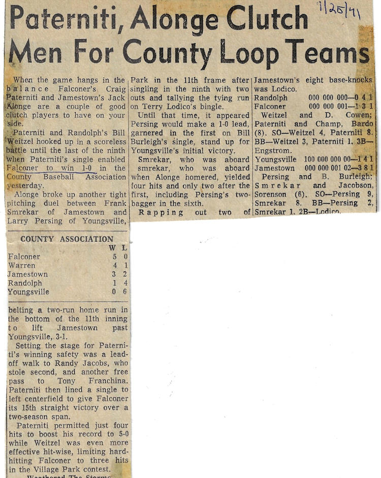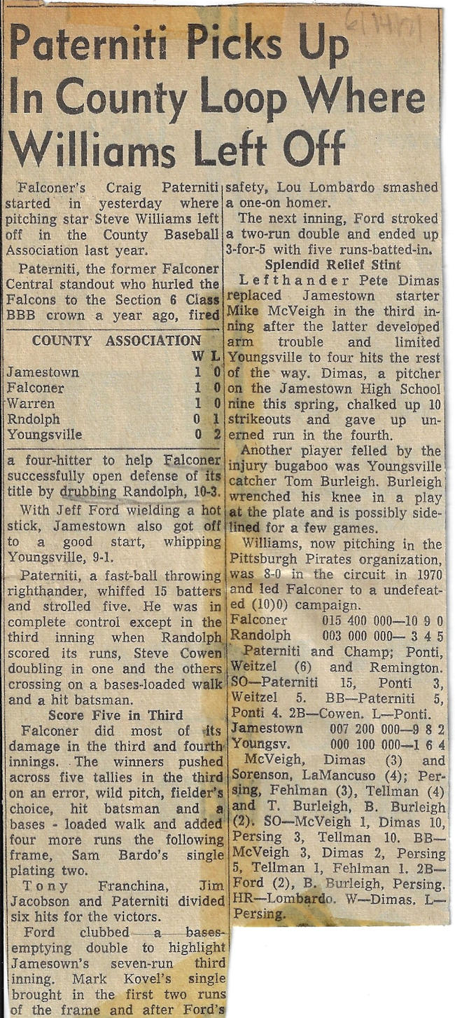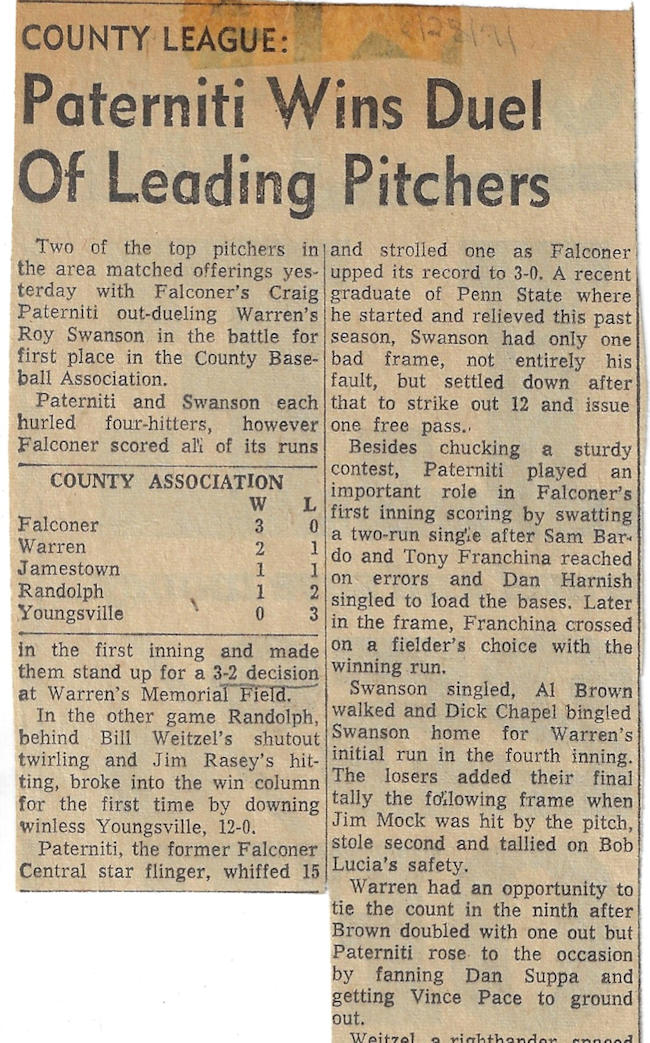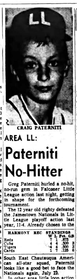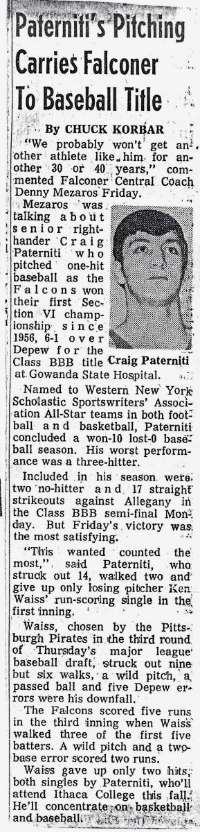 Paterniti was a four-year starter in baseball (1967-1970) for the Golden Falcons and was named All-Western new York in his senior campaign for coach Dennis Meszaros. He was a tremendous pitcher and during his career hurled three no-hitters en route to being selected CCIAC First Team from 1968-1970. His talents allowed him to be drafted by the Cleveland Indians, but he instead went to Ithaca College where he continued to excel in baseball. Paterniti, along with Kevin Martin, who was drafted by Detroit, are the only players from Falconer ever drafted.