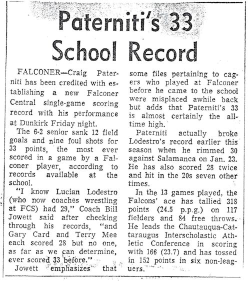 Paterniti was chosen to the Chautauqua-Cattaraugus Interscholastic Athletic Conference First Team as a senior after being named to the Second Team both as a sophomore and a junior. When he was a sophomore, Paterniti was on the first Falconer team that made the Section 6 championship at Buffalo's Memorial Auditorium in 17 years. He tallied 18 points and was the Golden Falcons' top scorer in a six-point loss to Salamanca.