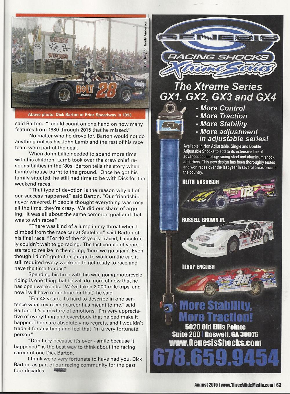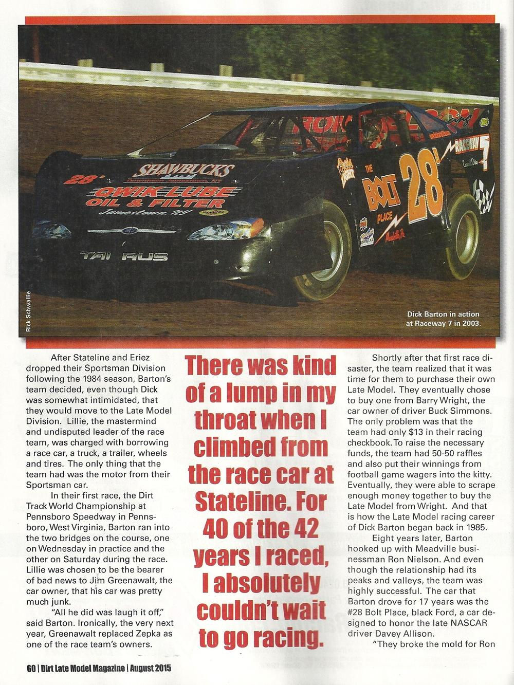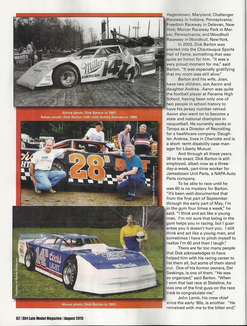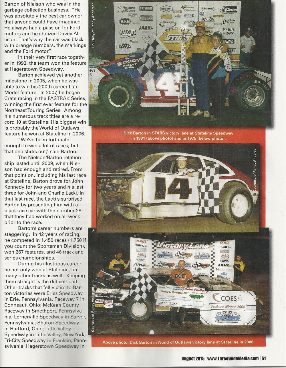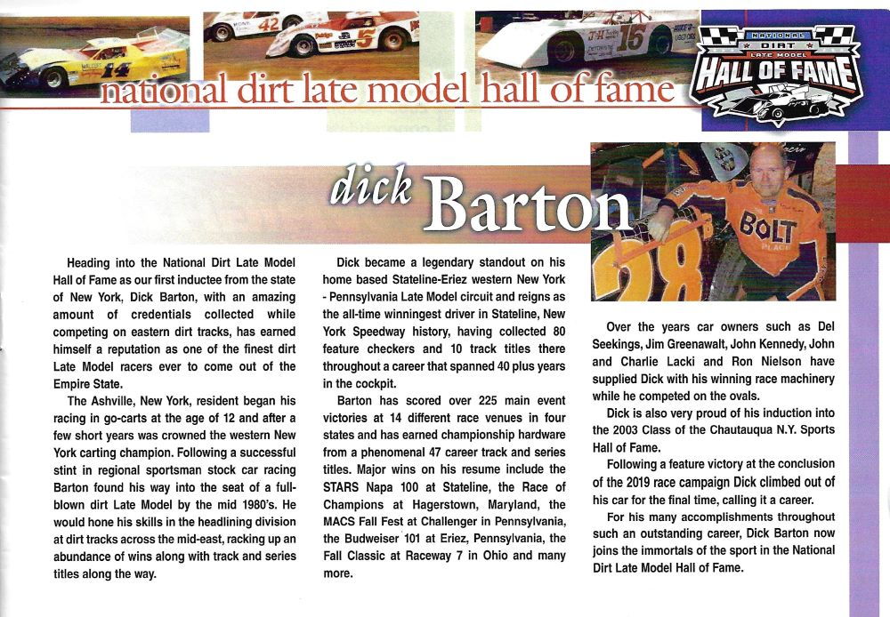 When area auto racing fans think of standouts the name of Dick Barton will have to be near the top of any list. In a career that spanned 42 years, he has set standards that may never be equaled.
