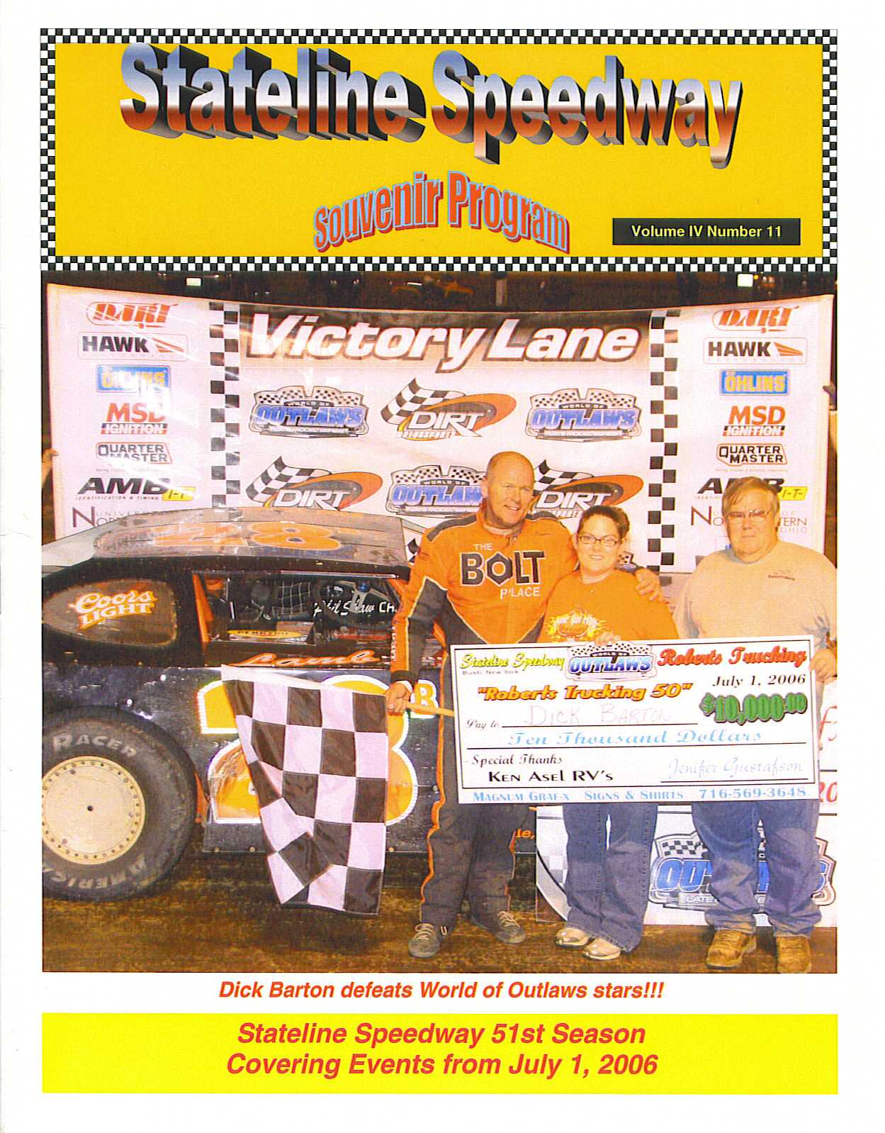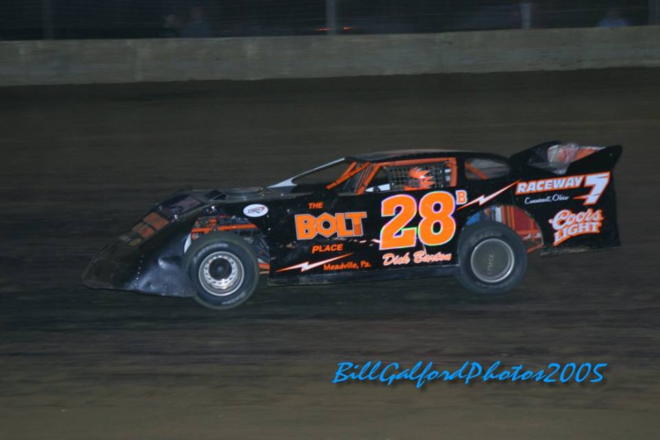 More records were set during the 2006 season. First, Dick won the Stateline Speedway Late Model Point Championship for the 9th time, breaking the previous mark of 8 held by the legendary Bob Schnars. Second, Barton's four wins at Raceway 7 pushed his career total to a new record of 35 late model victories at the Conneaut, OH speedway, eclipsing the mark formerly held by Chub Frank. Third, on July 1st, Dick became the first "local" driver to ever win a World of Outlaws Late Model Series event when he captured the $10,000 to win Roberts 50 at Stateline. Barton set fast time, won both his heat and the dash, and led flag to flag to defend his home turf against the Outlaw invaders. In all, the 28B team garnered nine wins (four at Stateline, four at Racway 7, and one at Challenger), 20 top three finishes, and 25 top 10 results in their 50 race season.