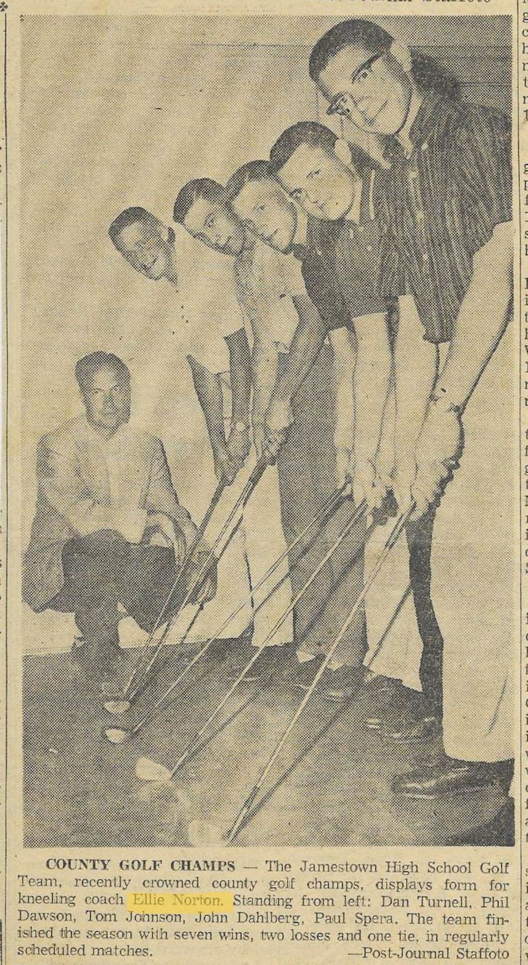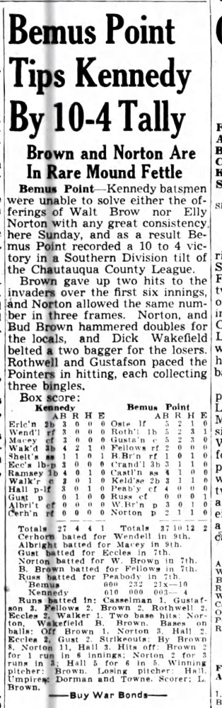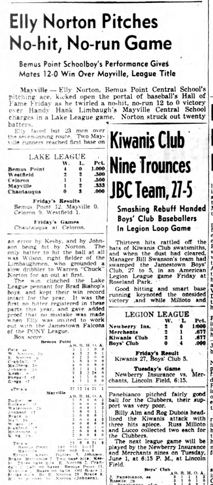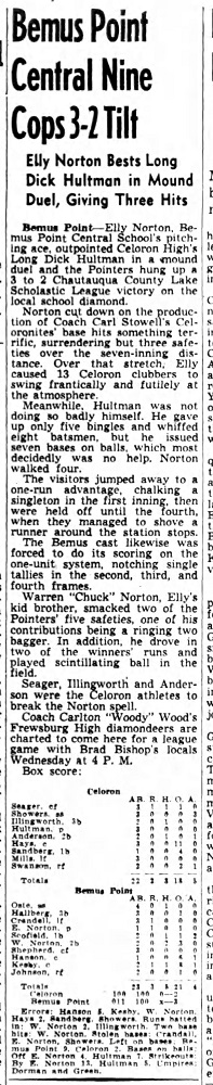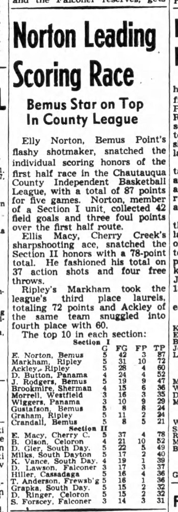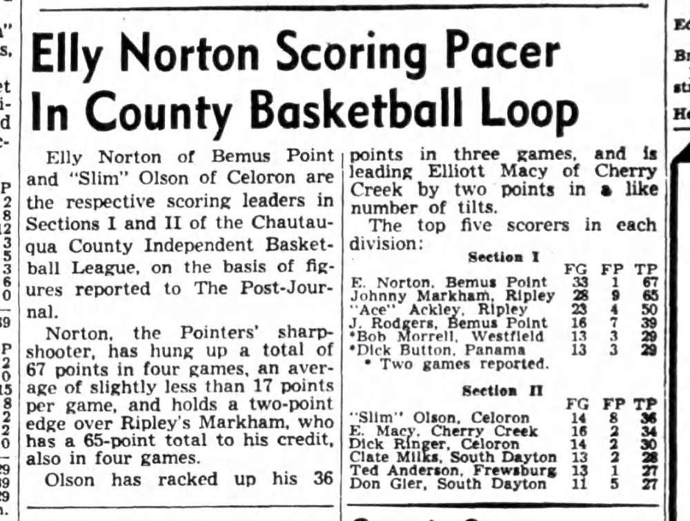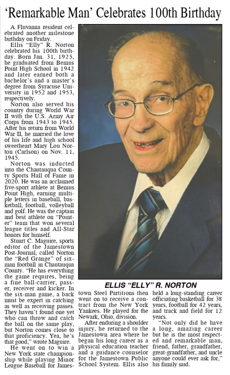 Stuart C. Maguire, sports editor of the Jamestown Post-Journal, called Norton the “Red Grange” of six-man football in Chautauqua County. “He has everything the game requires, being a fine ball-carrier, passer, receiver and kicker. In the six-man game, a back must be expert in catching as well as receiving passes. They haven’t found one yet who can throw and catch the ball on the same play, but Norton comes close to that proficiency. Yea, he’s that good,” wrote Maguire.