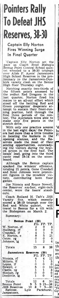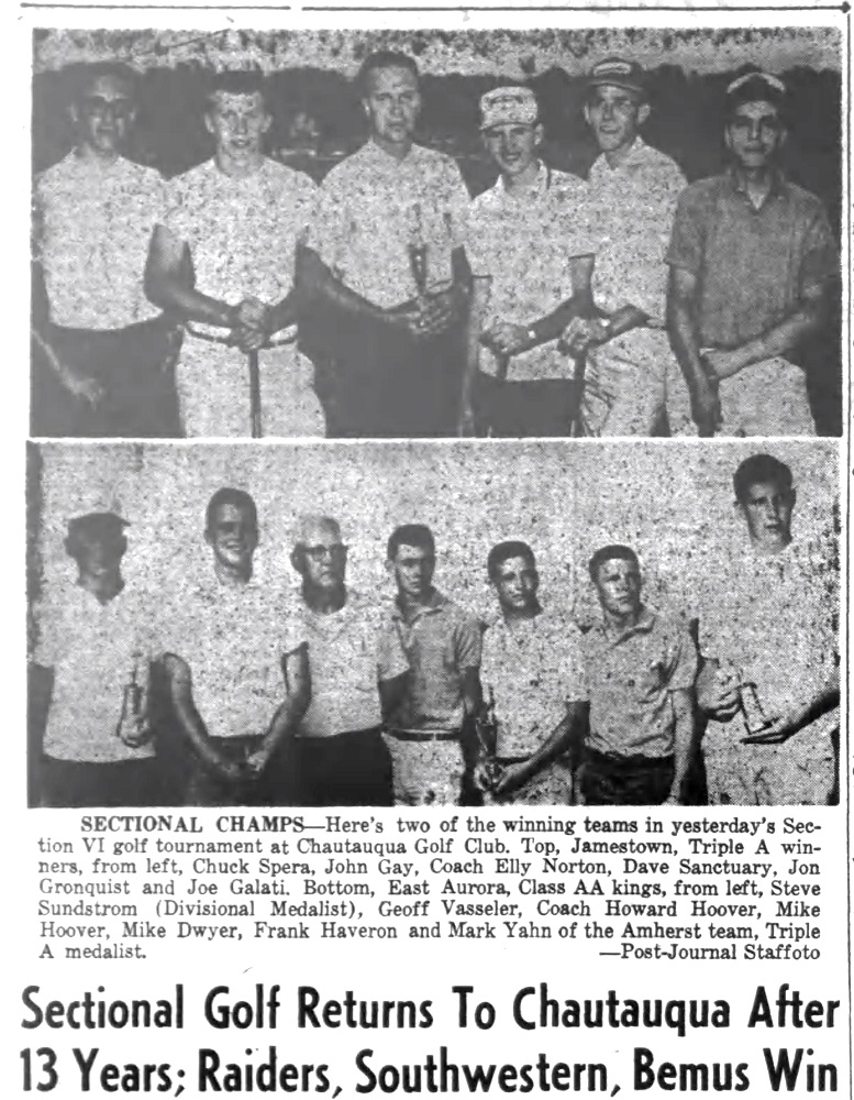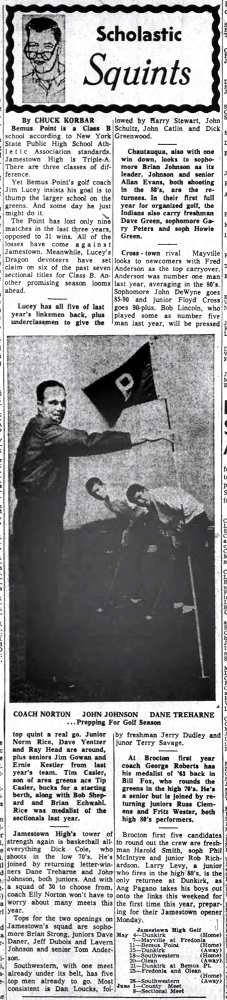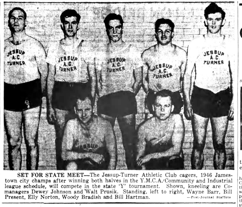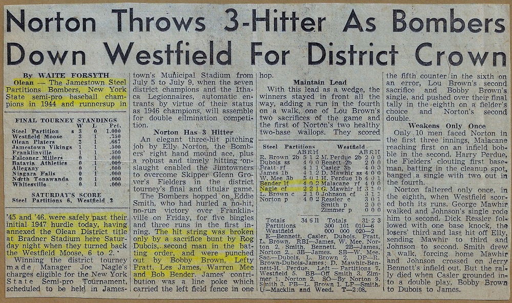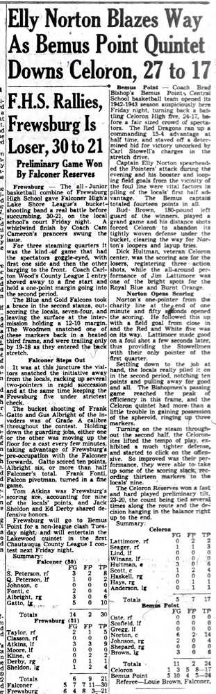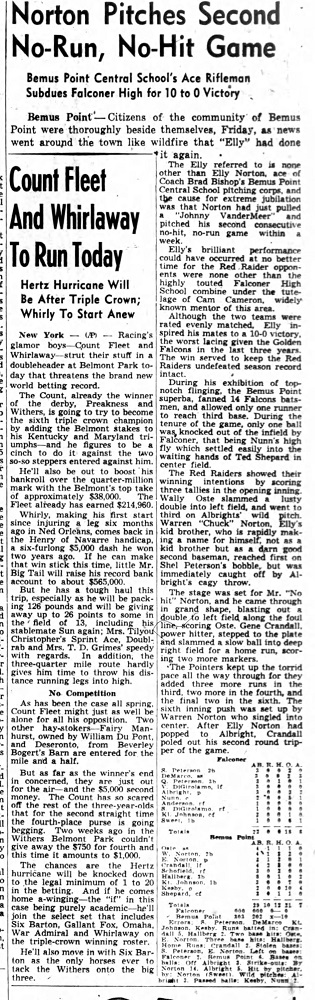 Stuart C. Maguire, sports editor of the Jamestown Post-Journal, called Norton the “Red Grange” of six-man football in Chautauqua County. “He has everything the game requires, being a fine ball-carrier, passer, receiver and kicker. In the six-man game, a back must be expert in catching as well as receiving passes. They haven’t found one yet who can throw and catch the ball on the same play, but Norton comes close to that proficiency. Yea, he’s that good,” wrote Maguire.