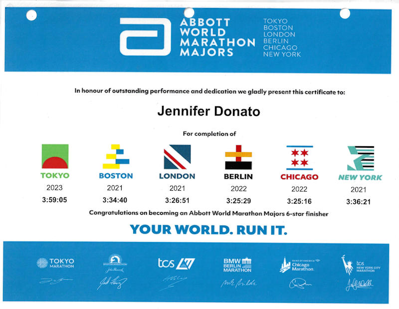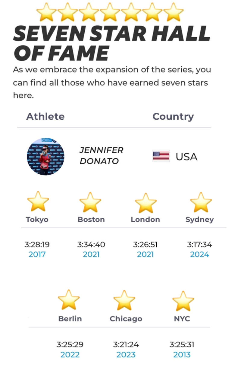 Giebner Donato had the honor of representing the United States at the Sydney (Australia) Marathon in 2024. That race, coupled with the 6 Abbott races, earned her membership in the Seven Stars Hall of Fame.