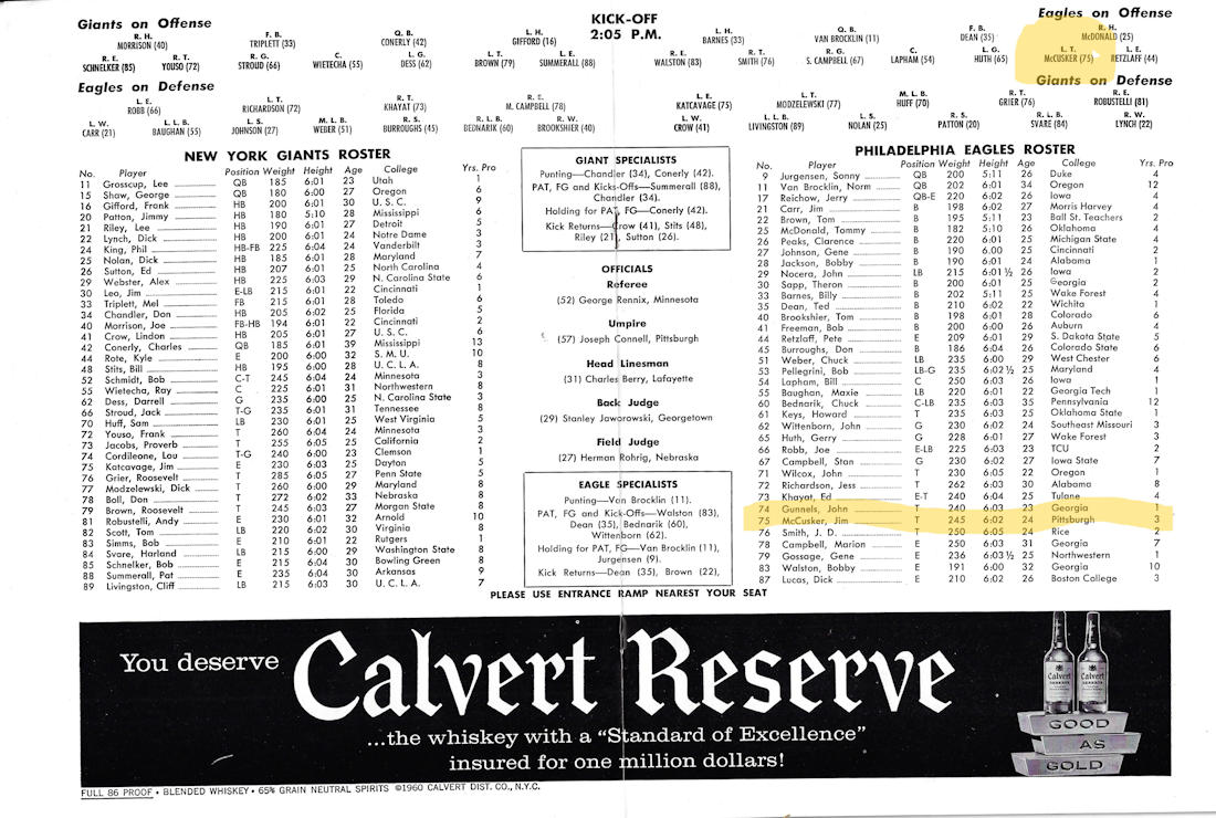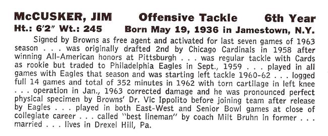 McCusker played in the NFL for seven years with the Chicago Cardinals, Philadelphia Eagles and Cleveland Browns and was a member of the Eagles when they won the NFL title by defeating Green Bay 17-13 in the 1960 championship game. His final year was played with the New York Jets in 1964.