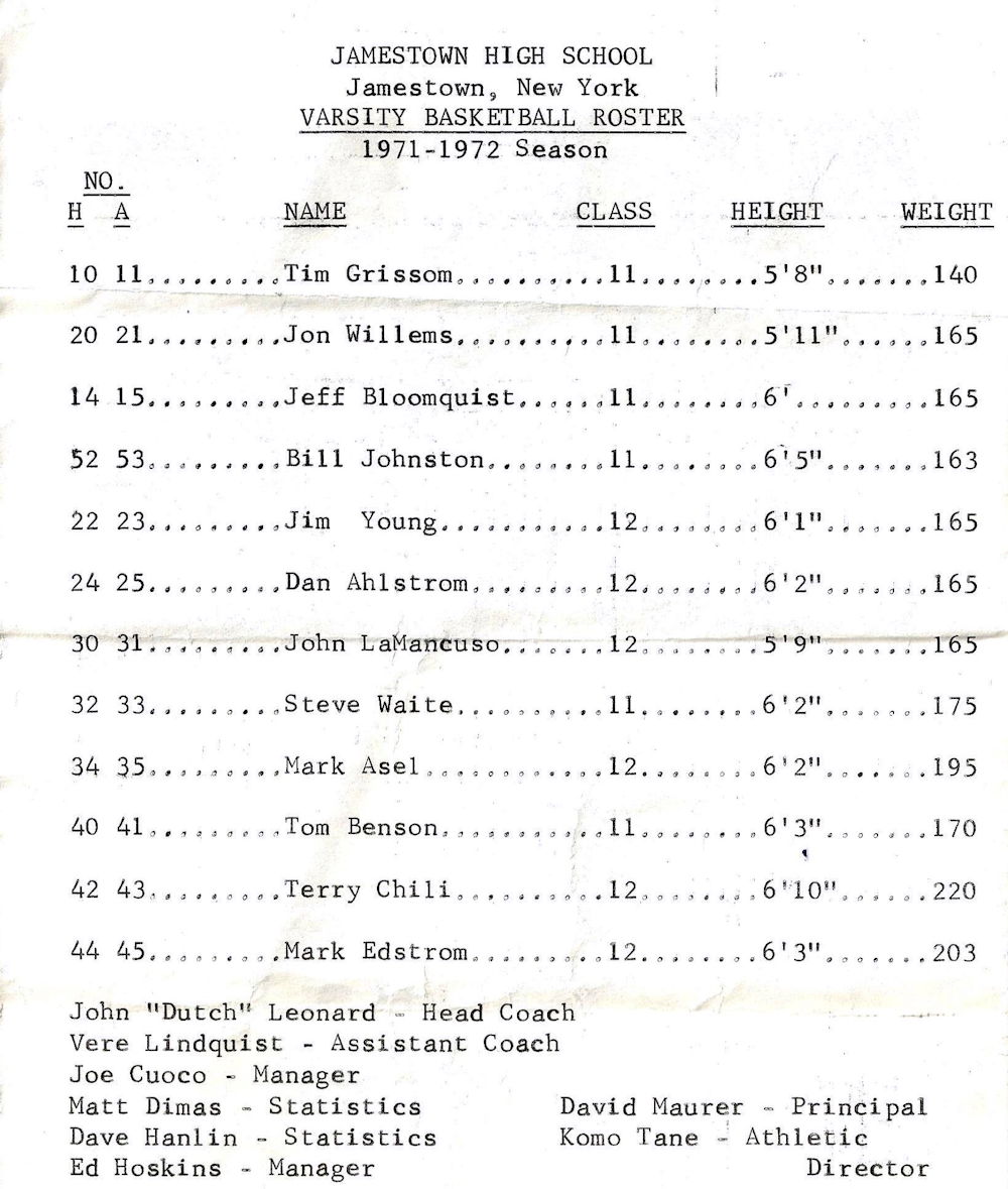 During the 1971-72 season at JHS, Young made his own mark on a team that featured legendary players Terry Chili and Mark Edstrom by averaging 15 points per game as the point guard while playing for another legend, coach John "Dutch" Leonard. That team packed the JHS gym regularly and when it was all said and done, it brought home a Section 6 championship, beating Kenmore West, 56-46, in come-from-behind fashion.