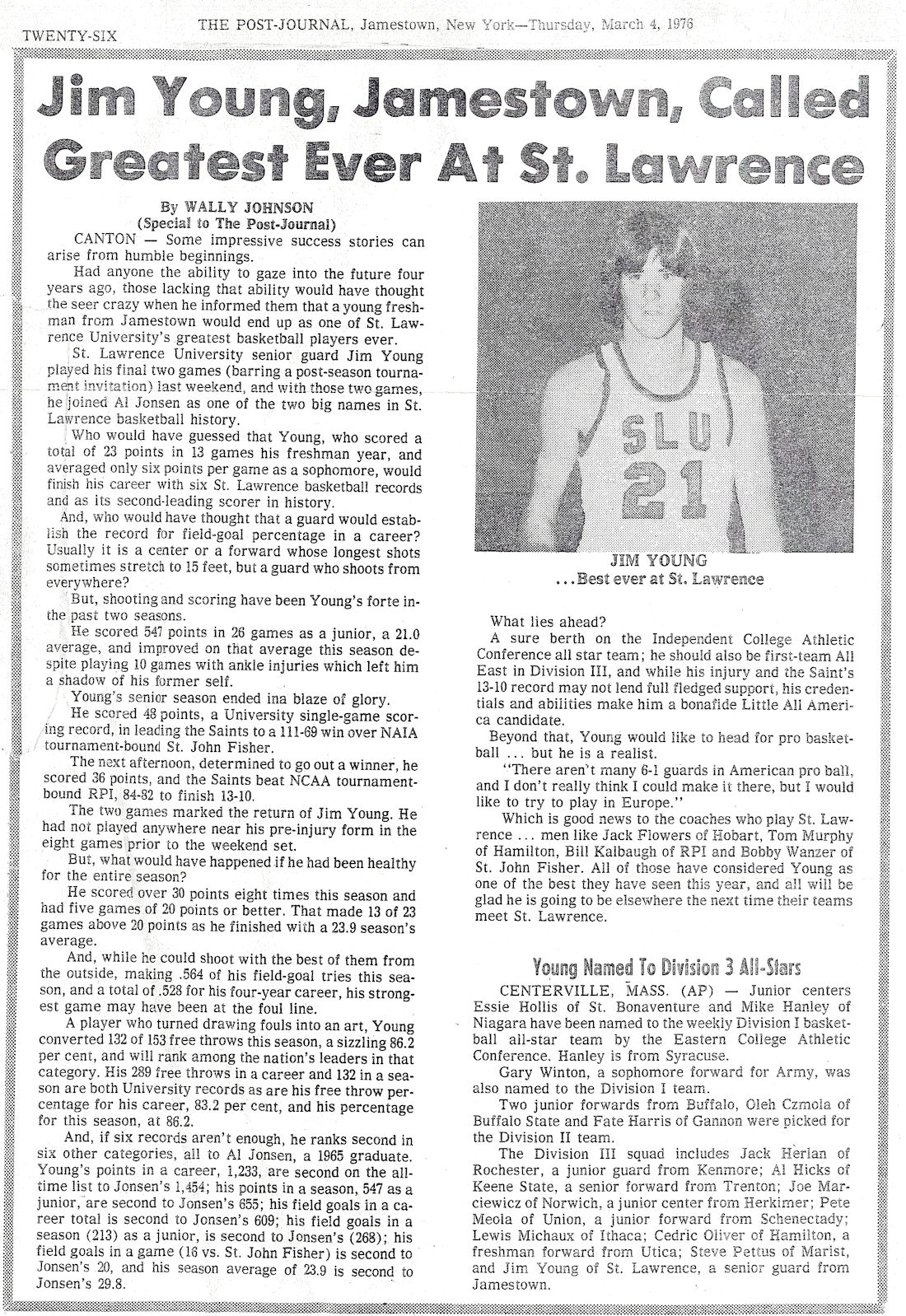 "He was my neighbor 40 years ago on Jamestown's west side, he drove a Volkswagen and he played for a high school basketball team that was better - at least from an 11-year-old's perspective - than what any collegiate or pro organization could put on the hardwood. To me, Jim Young was a star. What I didn't know was that he was just beginning to crack the surface of his potential."