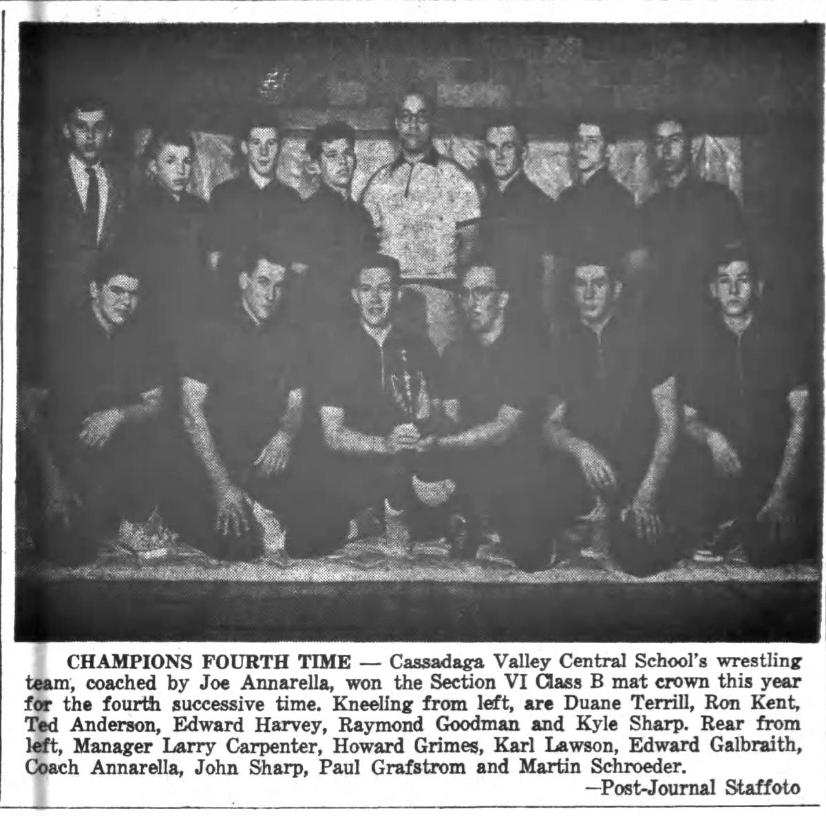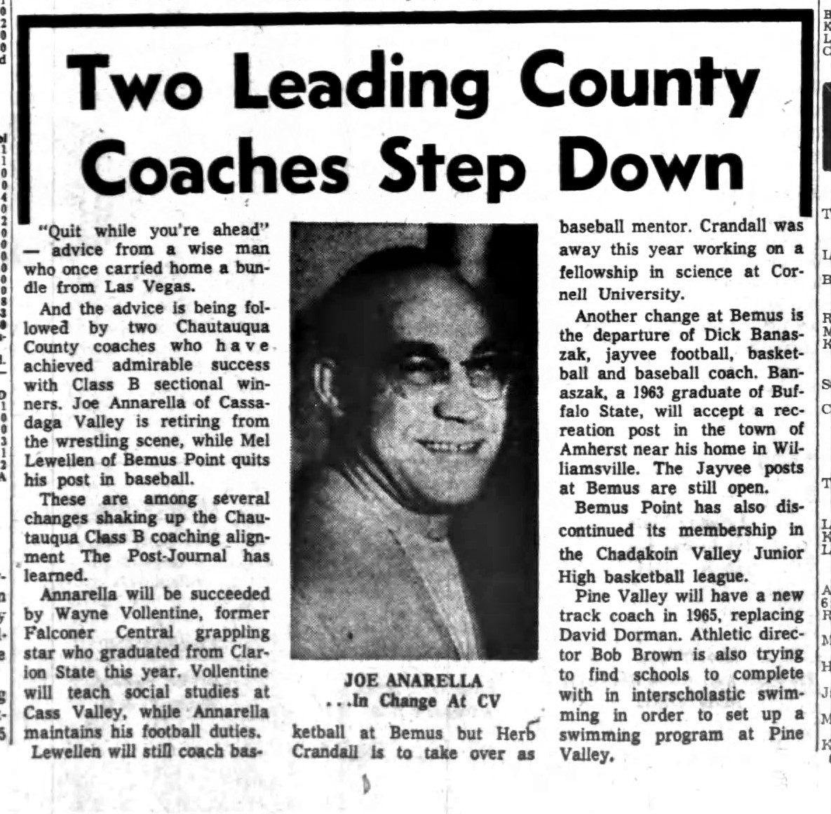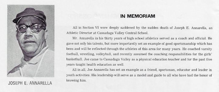 In addition to starting 11-man football, Annarella started the wrestling program in 1955 and remained the coach until 1964 with nine Section 6 Class B Titles. He also started girls basketball in 1973 and continued to coach that team through 1976. He also started girls volleyball in 1972 and coached it through 1976.