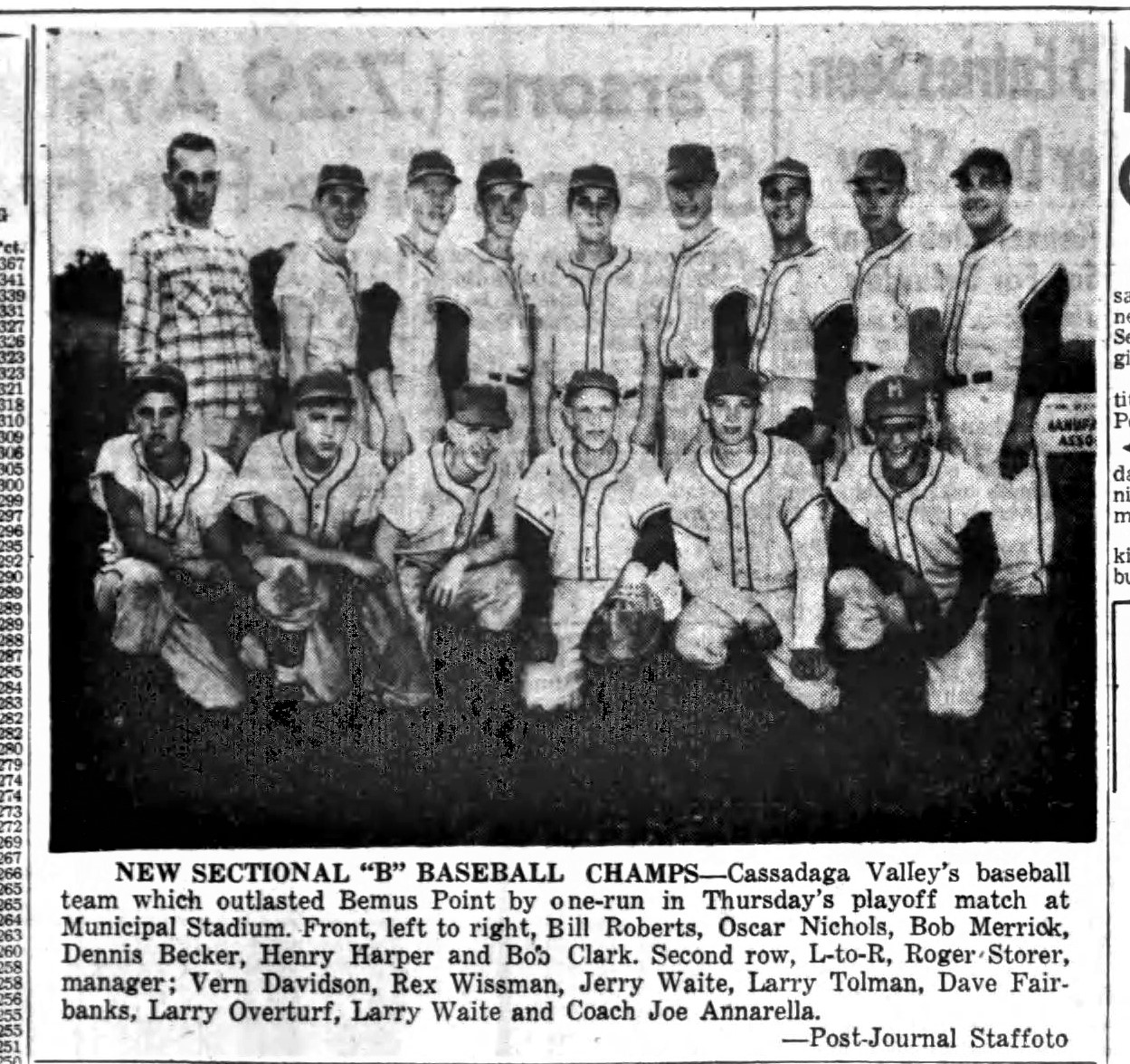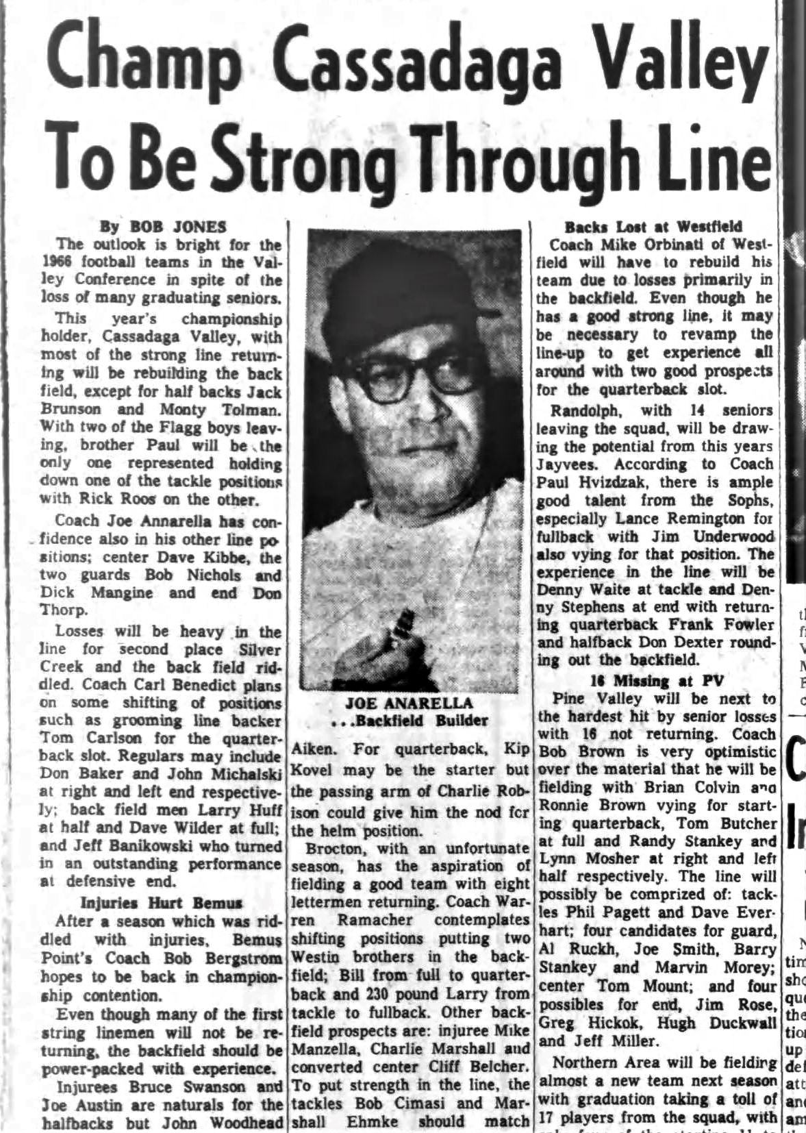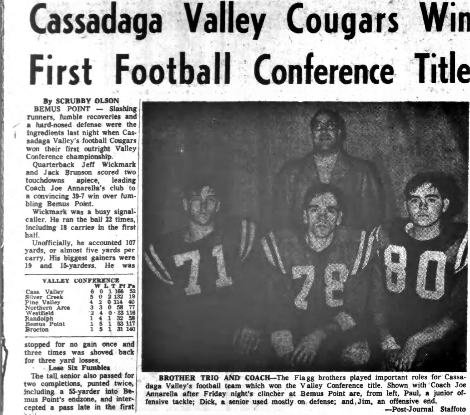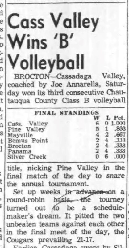 He began 11-man football at Cassadaga Valley in 1954 and racked up a 103-65-7 record with 15 winning campaigns. In 1958 Cassadaga Valley was co-champion in the Valley Conference and sole champion in 1965, 1966 and 1967. During the period from 1965-1968, the Cougars were 21-2-1, including the school's only unbeaten 8-0 club in 1966 and 21-0-1 streak for one of the longest in Chautauqua County history.
