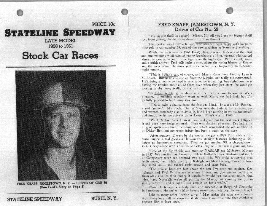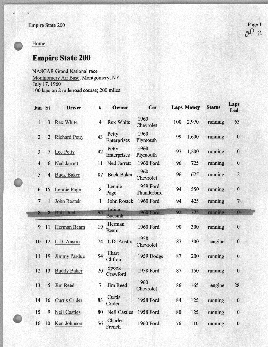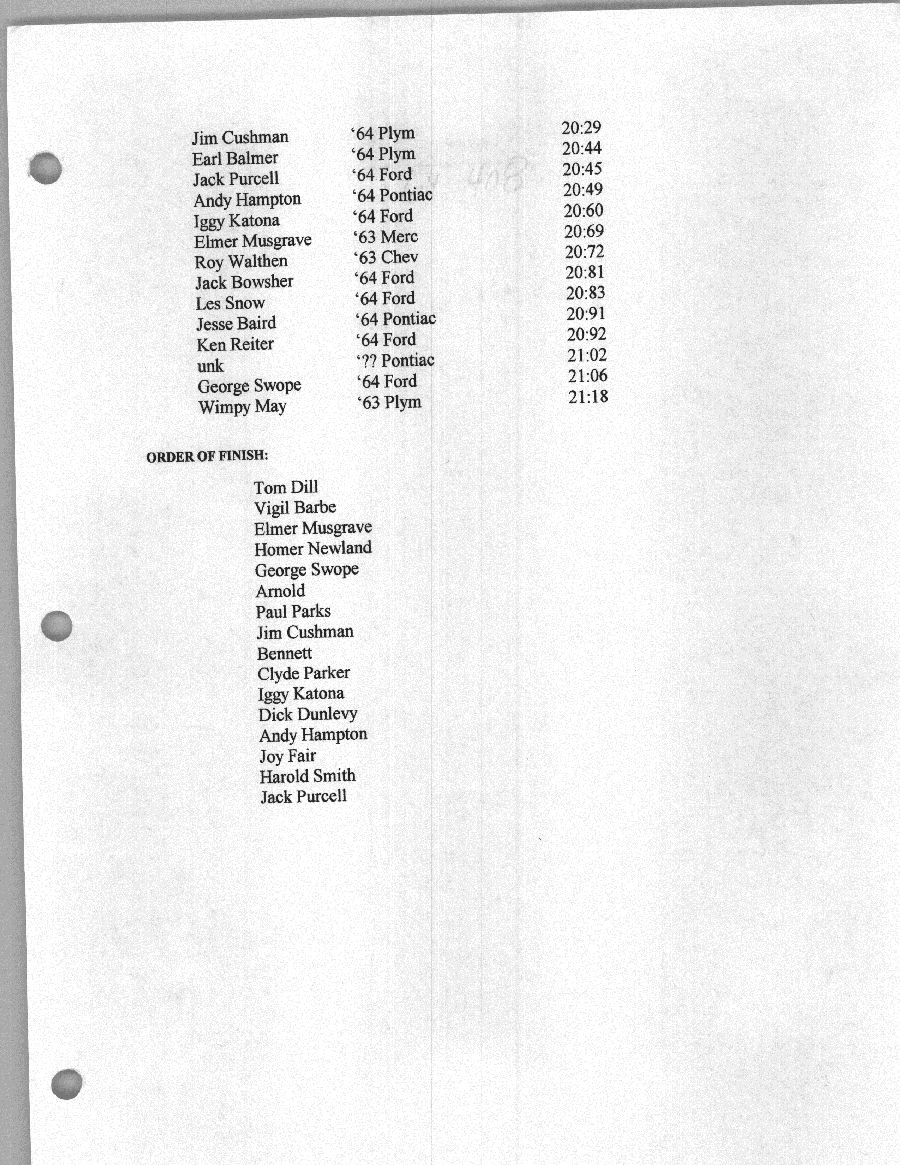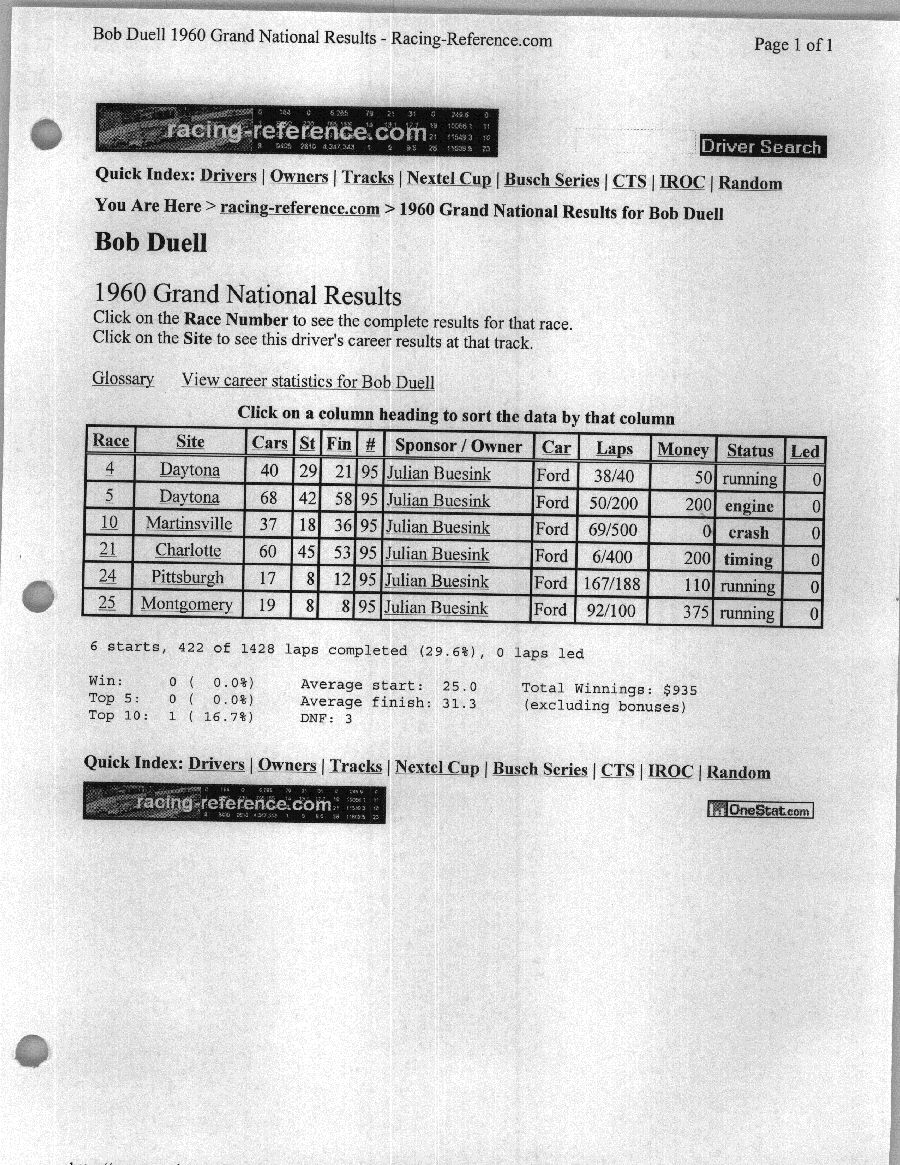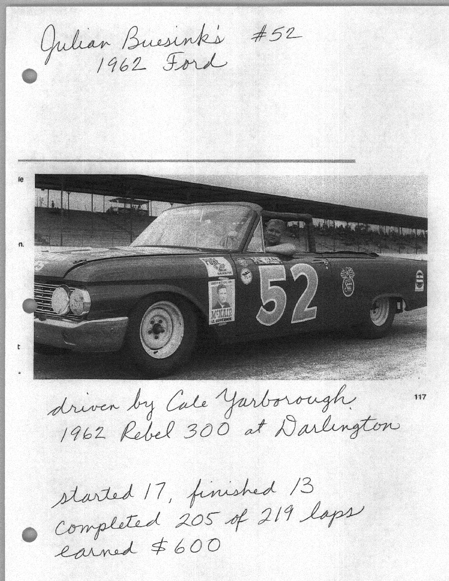 To support the nomination of Julian Buesink to the CSHOF, research on his auto racing career was compiled by Dennis Goggin and organized by the year covered.