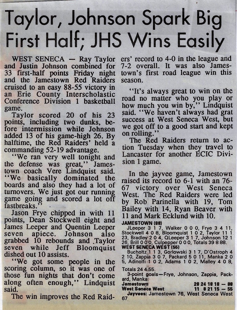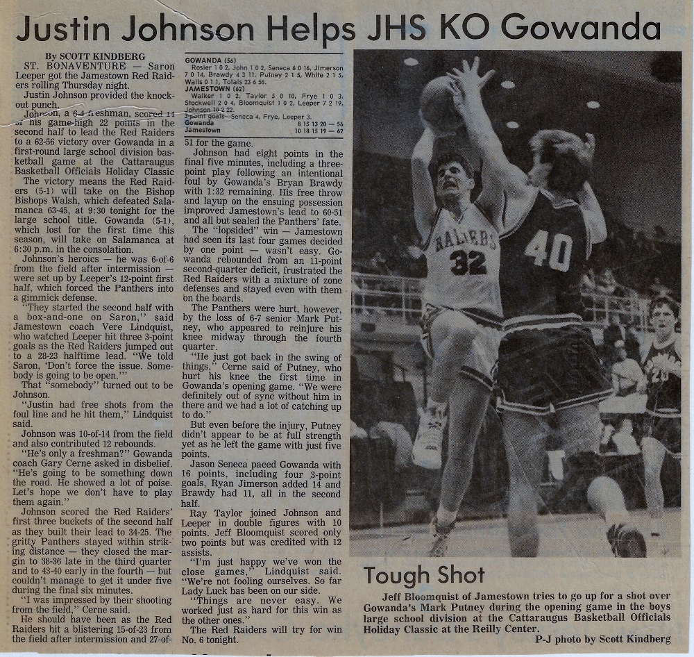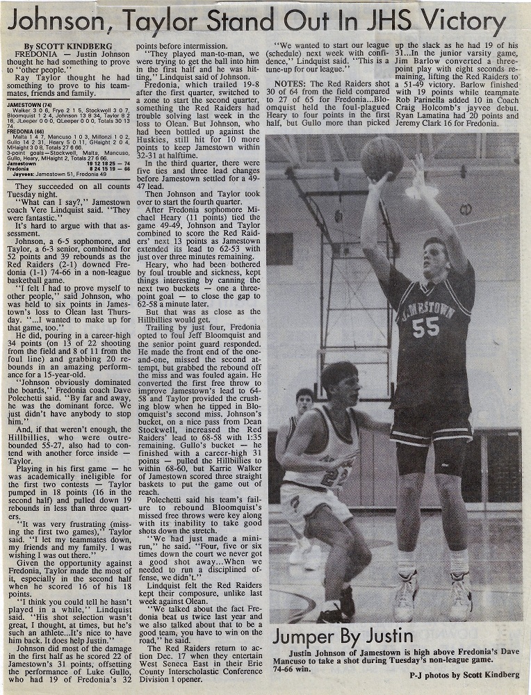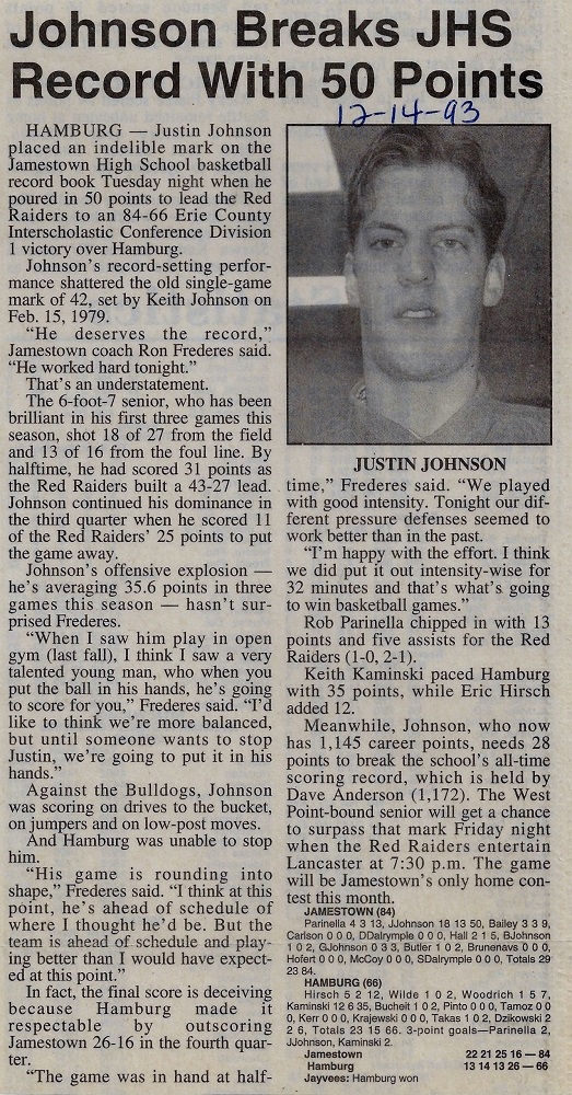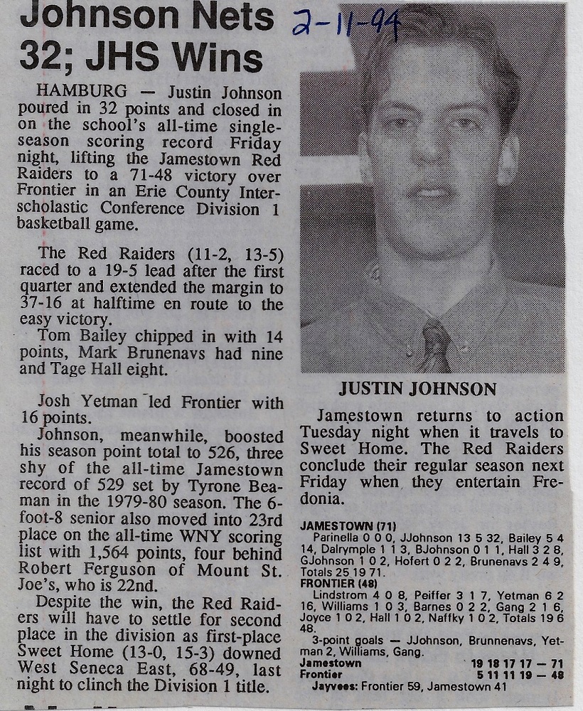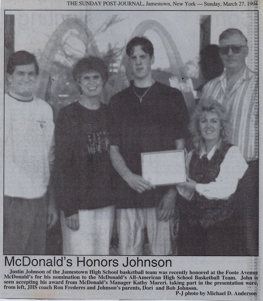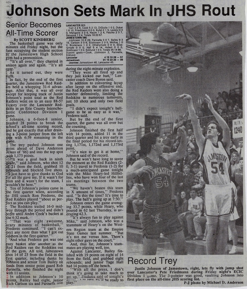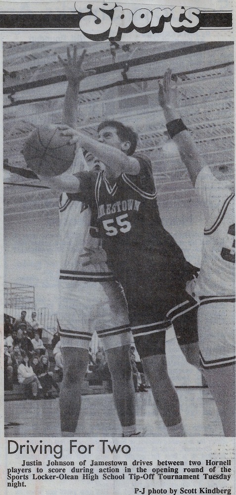 Johnson was the first freshman in the history of Jamestown High School to play varsity basketball. During his distinguished JHS career from 1990-1994 he set school records for single game scoring (51), single season scoring (29.0 ppg), career points (1,670) and career rebounds (857). He still holds the career rebounding record. His jersey (#54) was retired at JHS.