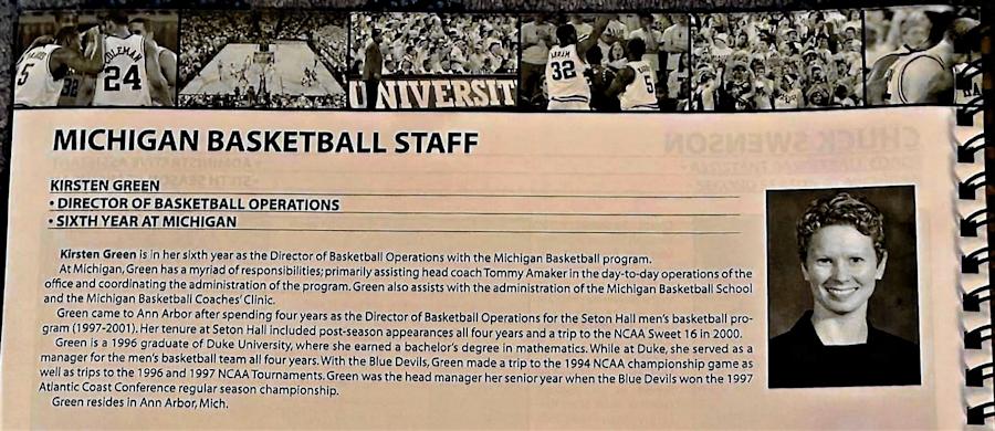 Kirsten attended Duke University graduating in 1997 with a degree in mathematics. While at Duke she served four years as student manager with the men’s basketball team. Coach Mike Krzyzewski named her as a head manager in her senior year.While at Duke, Green worked closely with assistant coach Tommy Amaker. When Amaker left Duke in 1997 to accept the head coaching job at Seton Hall University, he asked Green to go with him to become the Director of Basketball Operations at the South Orange, New Jersey university.