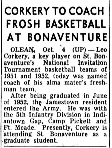 Corkery was an assistant basketball coach, teacher and scout for the Bonnies from 1955-1956 and an assistant basketball, baseball, teacher and scout for Toledo University from 1957-1959. He coached CYO basketball from 1972-1973 in Bethel, Connecticut.