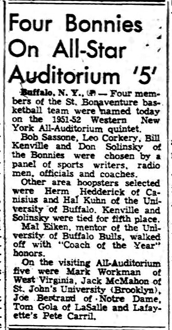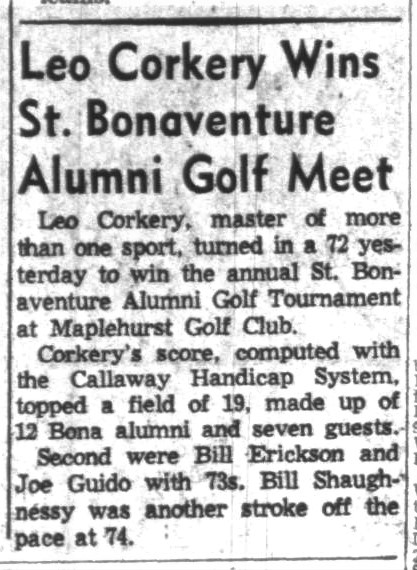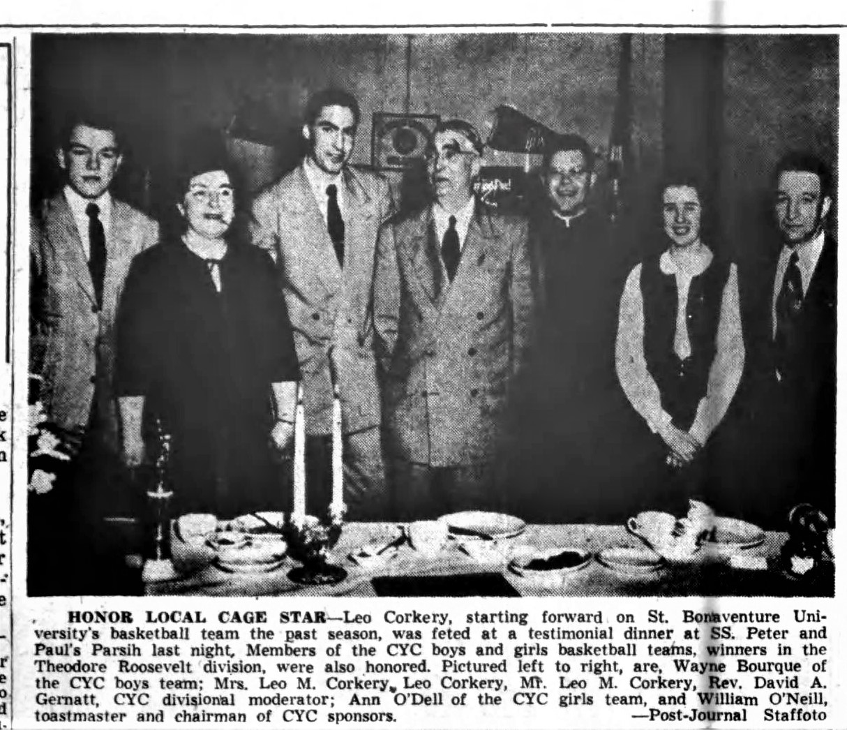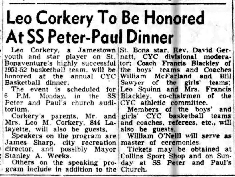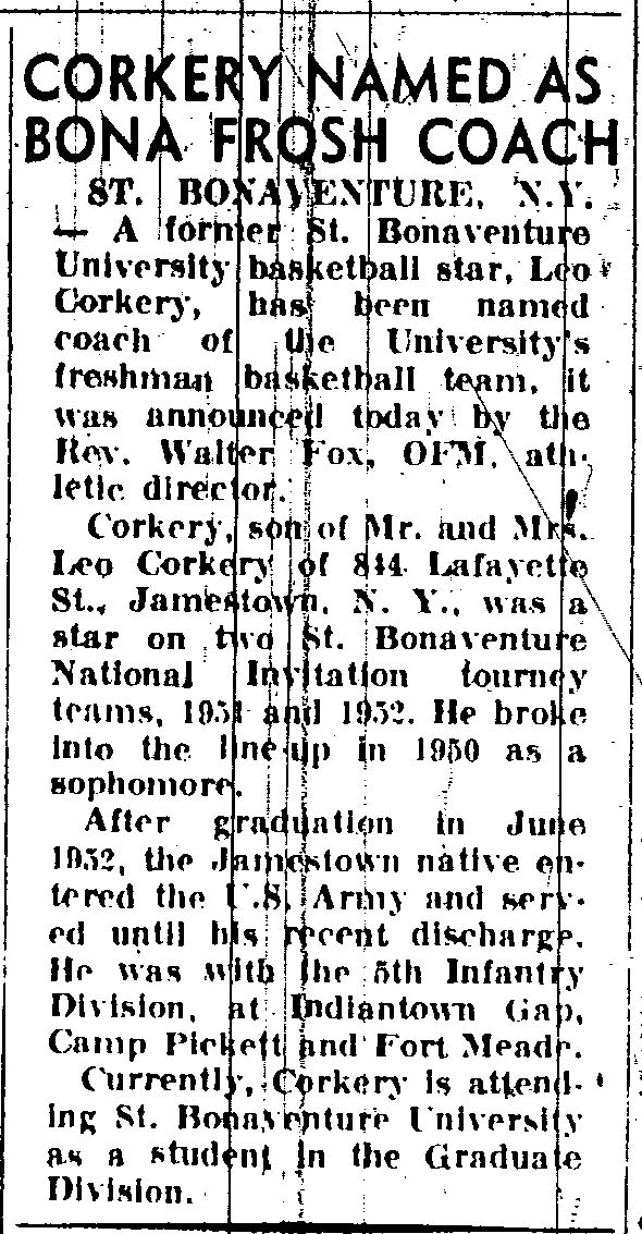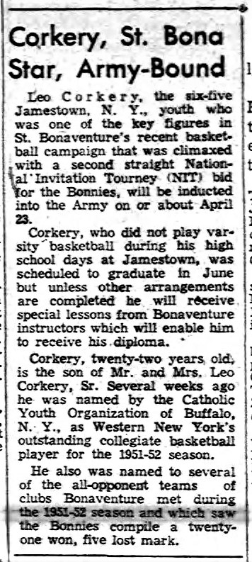 In 1951-1952, Corkery was voted the outstanding athlete by the St. Bonaventure student senate and was named to the Buffalo Memorial Auditorium All-Star Team and an honorable mention All-American. Also, he was awarded the Catholic Youth Organization "Most Valuable Player" trophy for Western New York and had a testimonial dinner given by St. Peter & Paul.