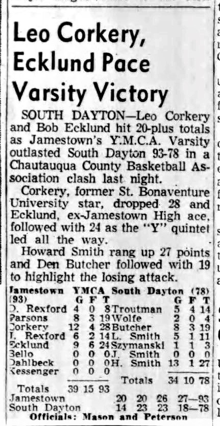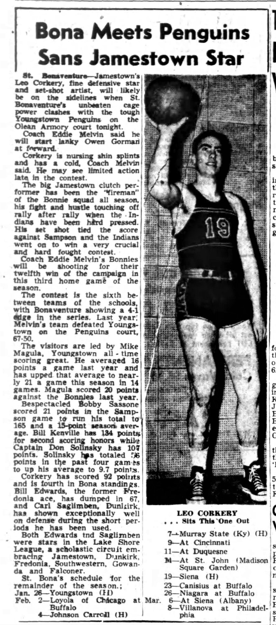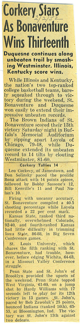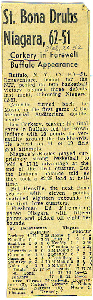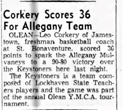 During his senior year, he tossed in 25 points in a win against Little Three arch-rival Niagara, whose famed Coach Taps Gallagher stated that Corkery did everything but sell tickets at the game.