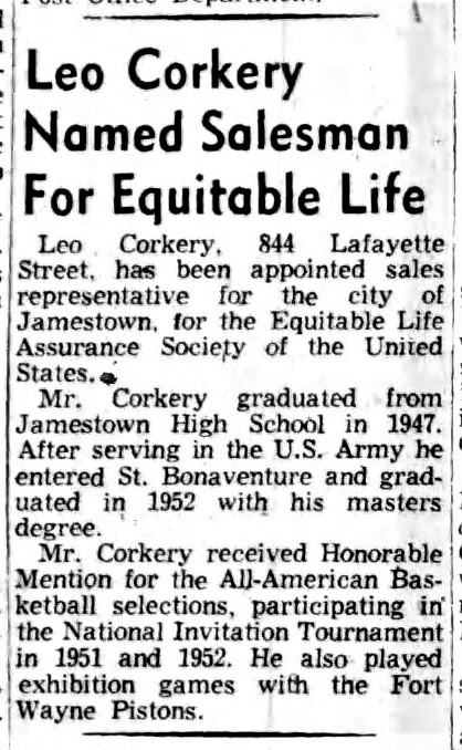 For his accomplishments, the versatile Corkery received the high accolade of being drafted in the third round by the then NBA Fort Wayne Pistons (later the Detroit Pistons). Also drafted by the Pistons then was Duke All-American Dick Groat, who later became a top-flight shortstop with the Pittsburgh Pirates and the St. Louis Cardinals. This year (1952) marked the first time that the NBA kept complete records of team-by-team draft lists.