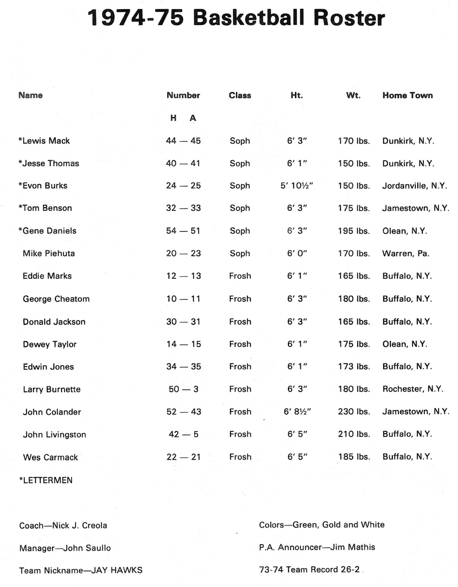 Chautauqua Sports Hall of Fame coach Mike Tramuta received a “gift” when Mack enrolled at Dunkirk High School for his senior year. Mack, along with teammates such as Jesse Thomas and Dave Szwejbka, compiled a sizzling 20-1 record in 1972-1973, earning the CCIAC championship, the Section VI Class A title and a lofty #2 ranking in New York State for the Marauders. Mack was known for his smothering defense, highlight-reel passes and amazing leaping ability.