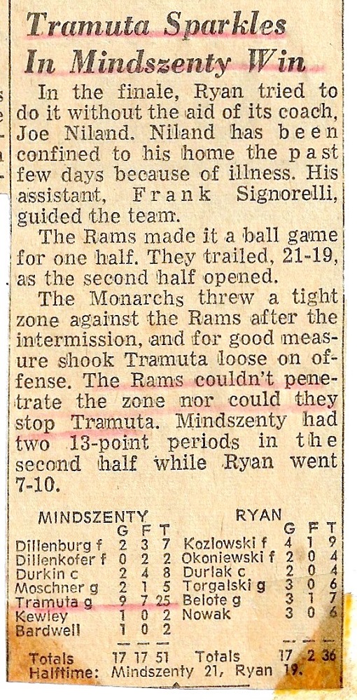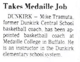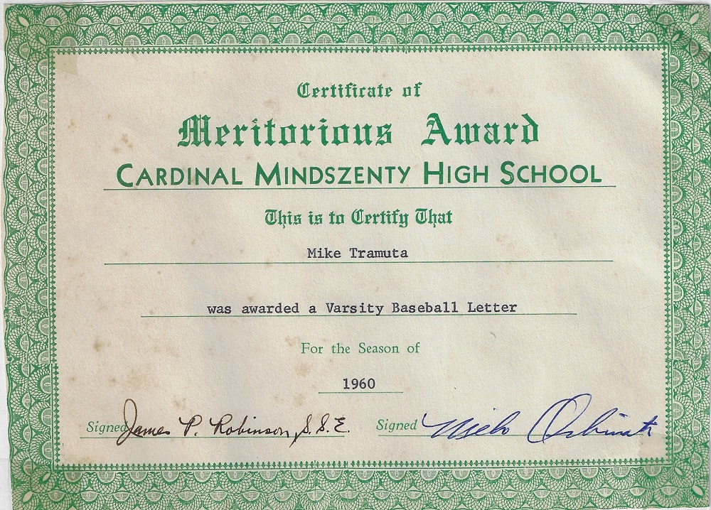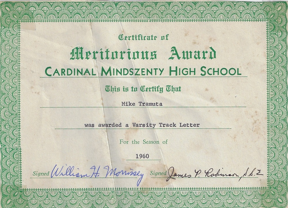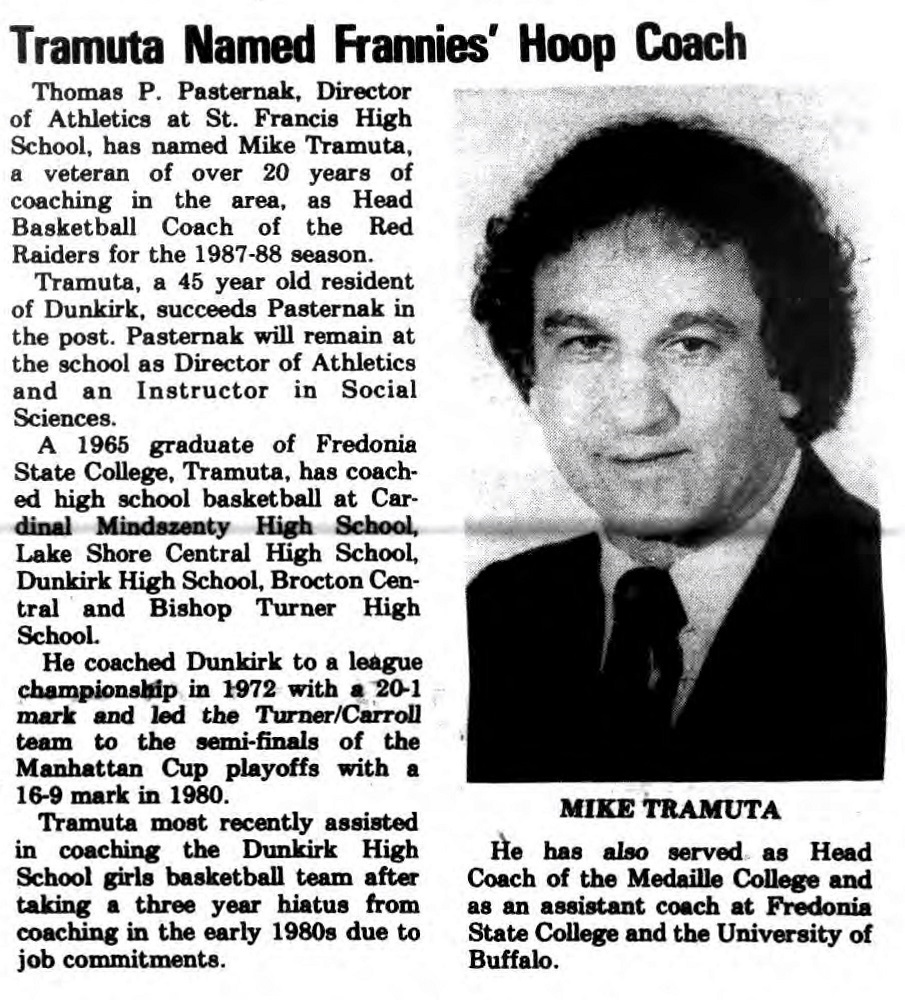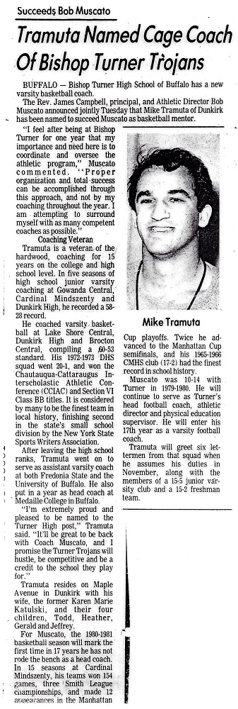 At Mindszenty, Tramuta competed in cross-country, basketball, track and baseball. He set a school record in cross country and was named to the All-Catholic team. In basketball, Mike averaged 14 points and 15 assists per game and was chosen as a First Team All-Star of the Bishop Smith League. He led his team to the Bishop Smith League track title establishing school records in the quarter, half and mile runs.