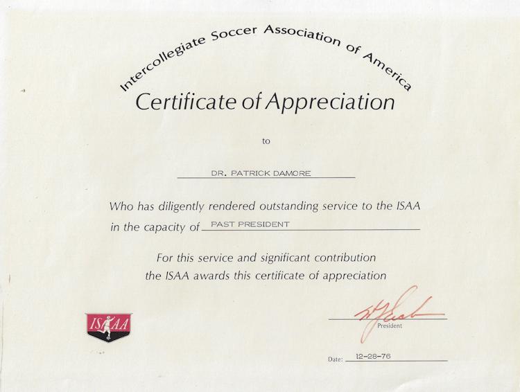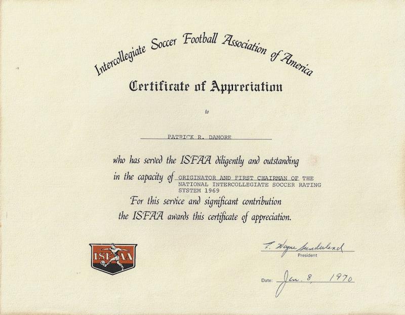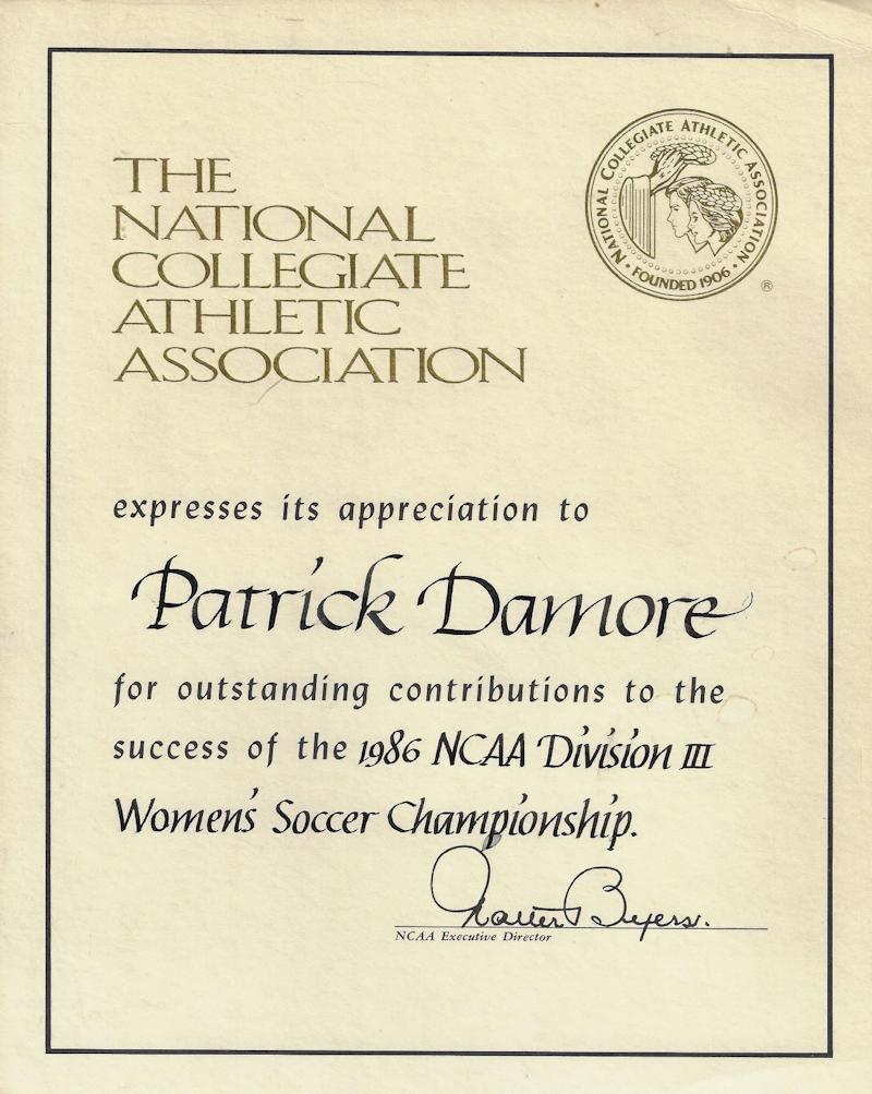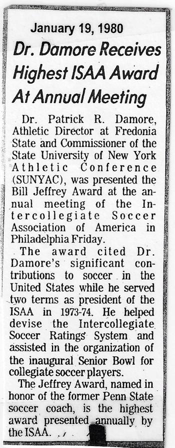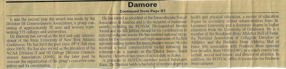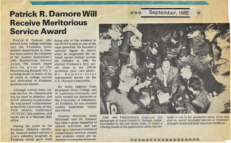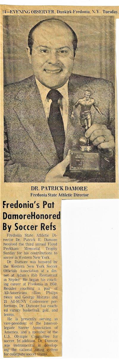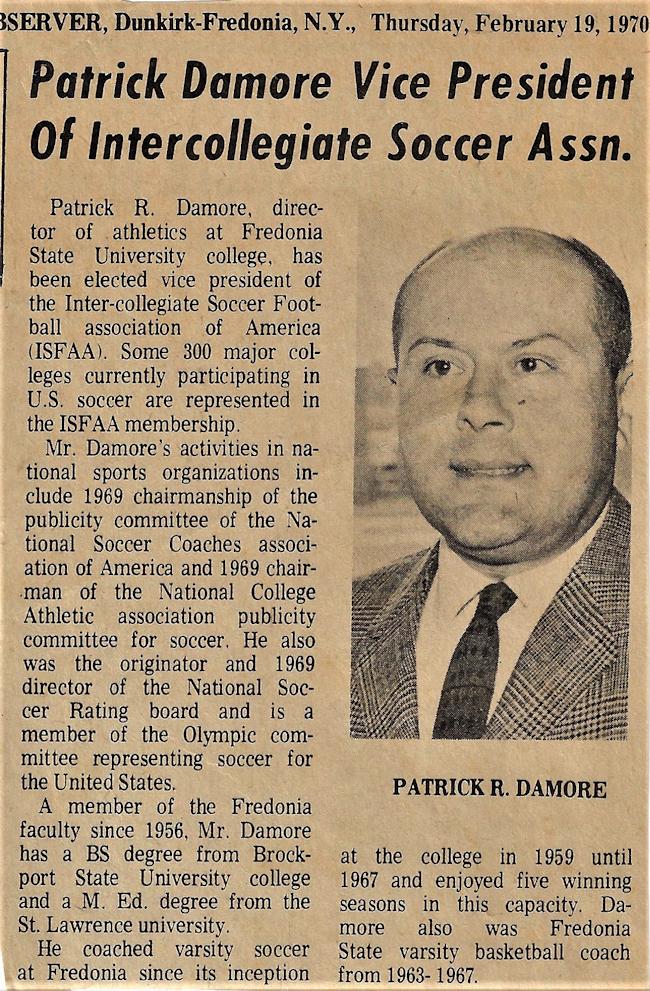 Damore, who earned his PhD from Oklahoma in 1971, began the first soccer team at Fredonia State in 1959 and originated the national collegiate soccer rating system in 1968 and served as the first national chairperson.