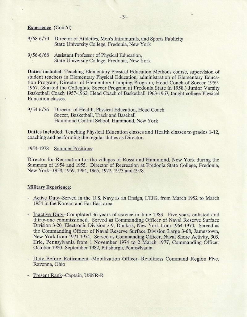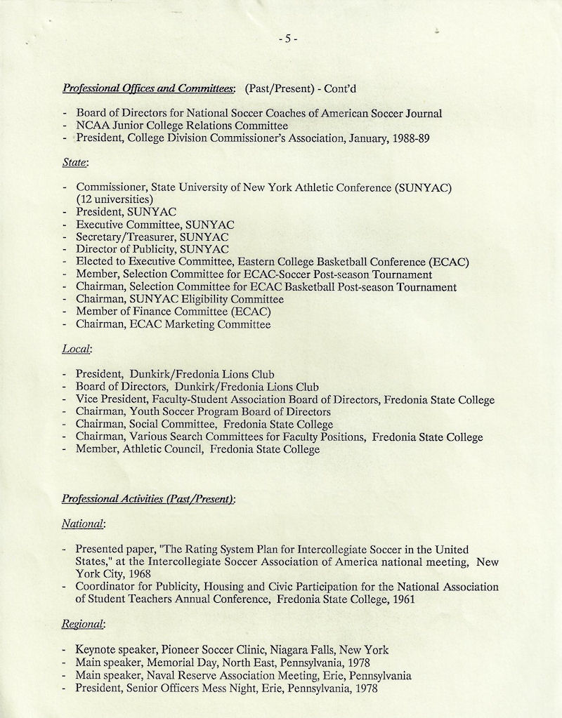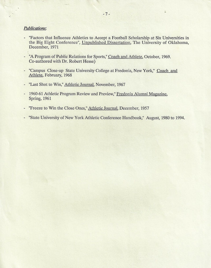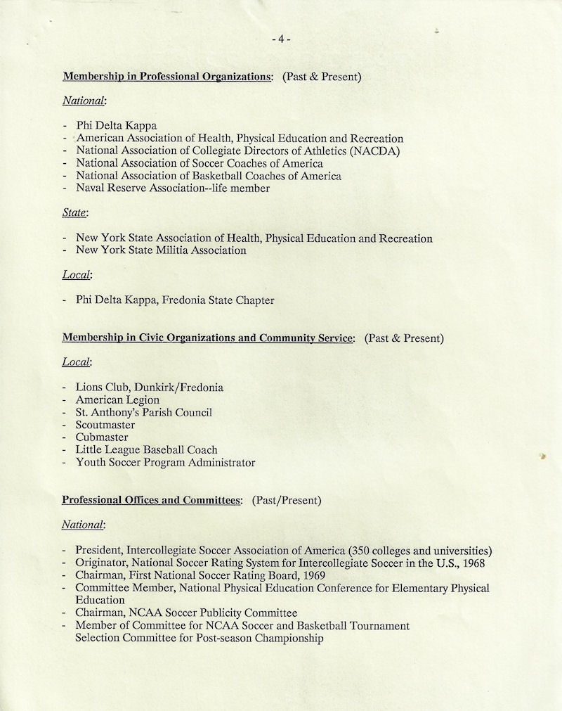 He served as the Fredonia State athletic director for 18 years starting in 1968 as well as coaching soccer, tennis and basketball.