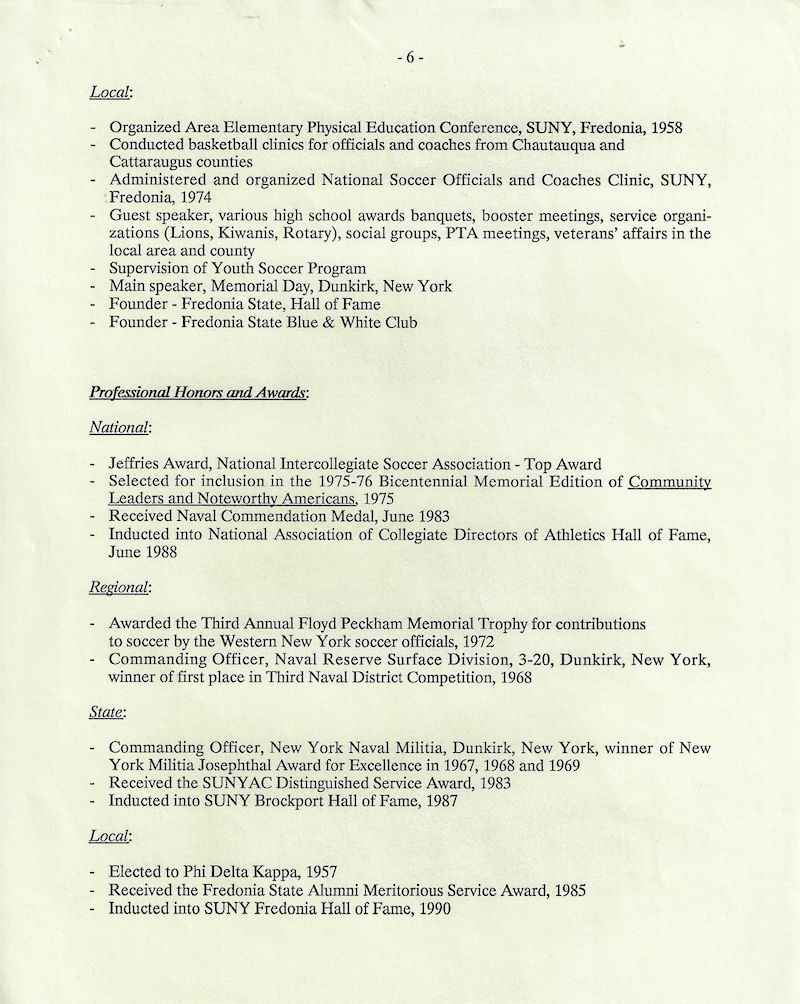 His accolades include NCAA Division III Commissioner's Association Meritorious Service Award, SUNYAC Distinguished Service Award, the Bill Jeffries Award for his contribution to national collegiate soccer and the ECAC James Lynah award for distinguished achievement. He also was awarded the Floyd Peckham Memorial Trophy by the Western New York Soccer Officials Association.