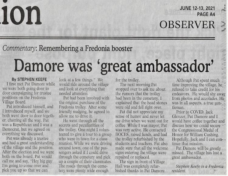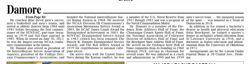 - "Dr. Patrick R. Damore." (obituary) Observer (Dunkirk), May 29, 2021.