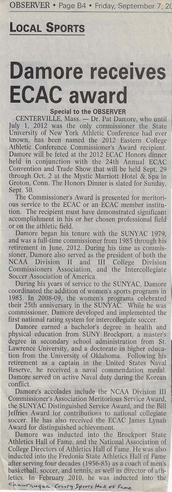 - "Dr. Damore announces retirement as SUNYAC commissioner." Fredonia State Department of Athletics. February 29, 2012. Accessed March 5, 2019. https://fredoniabluedevils.com/news/2012/2/29/GEN_0229120210.aspx?elinkdata=7695.