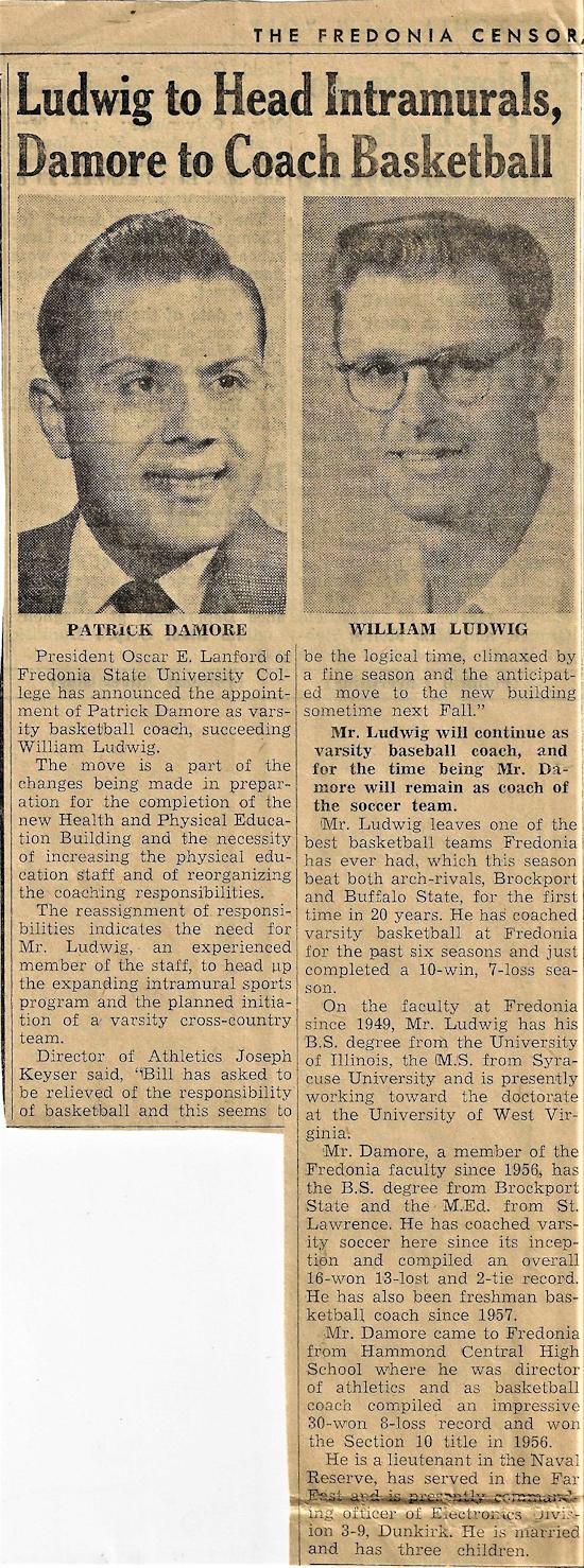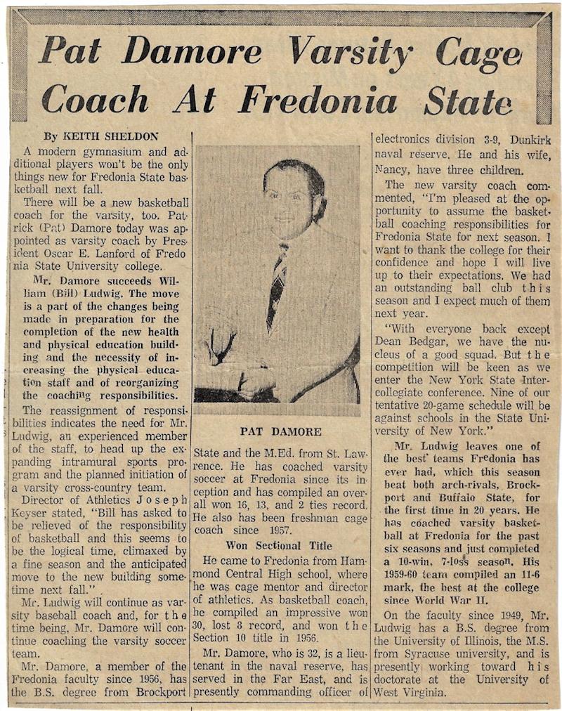 Holding degrees from Brockport State and St. Lawrence University, Damore came to Fredonia State in 1956 as an assistant professor.