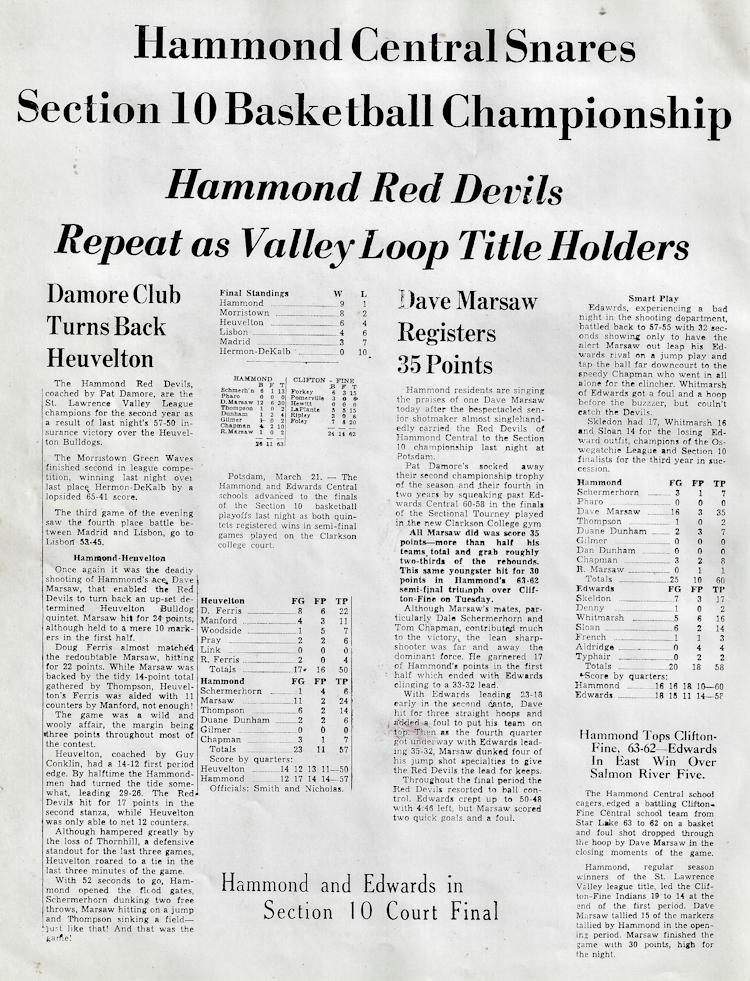 In 1954-1955 and 1955-1956, he won the St. Lawrence Valley Basketball League championships and in 1955-1956 he won the sectional title.