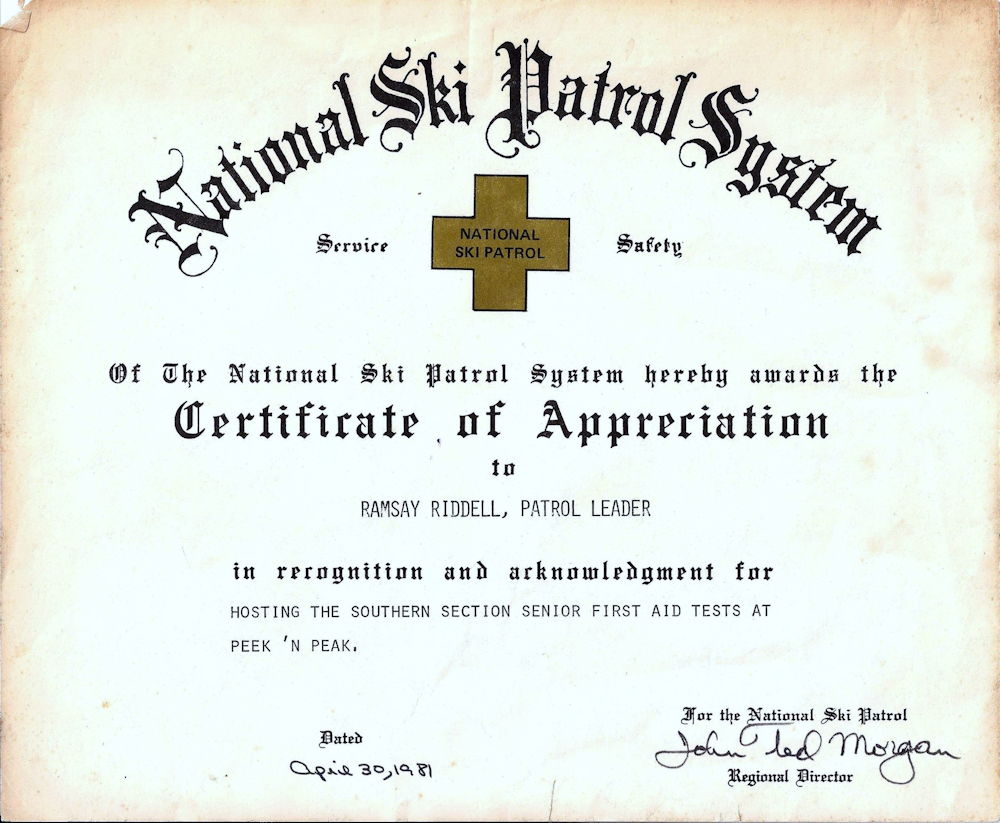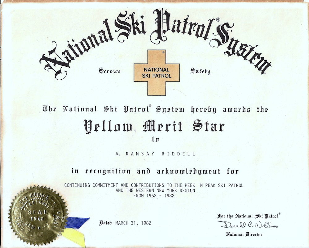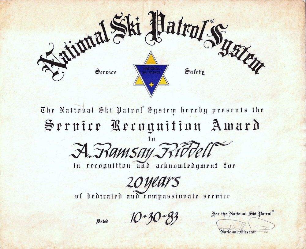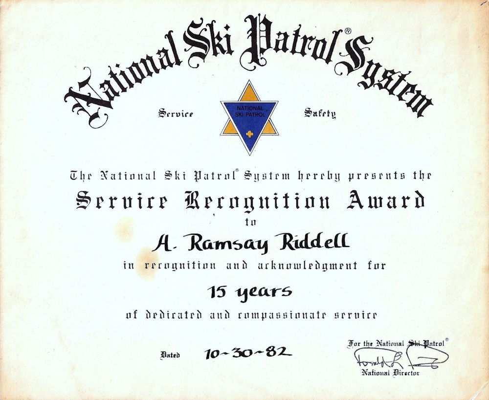 Riddell was also chosen out of more than 8,000 ski patrollers in the Eastern Division; and received recognition for his invention of a fruit ladder that was used for chair lift evacuation, which was acclaimed the safest and fastest method at that time. Many of the areas in the Northeast ski country adopted the use of this device.