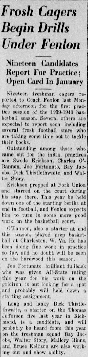 Erickson decided to go to Richmond University in the fall of 1939 where he played four years of football and basketball for the Spiders and made quite a name for himself. He also won the freshman class senatorship and was named to the all-state freshman basketball team.