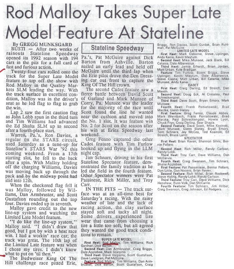 “Hot Rod” Maloy continued to race super late models at Stateline, Eriez, Raceway 7 and Little Valley Speedways until his retirement from the sport in 2012. The highlight among his 23 Stateline victories was a 100-lap feature win at Stateline in 1992. He earneded 8 checkered flags at Eriez and was a consistent threat to win on any given night no matter where he unloaded.